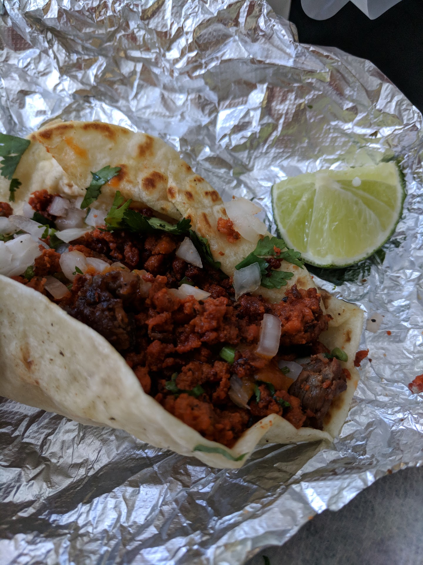 I was referred over to try out this authentic Mexican place. When I walked it in, it was quite busy and crowded so I decided to order to-go. Iordered 2 chorizo and 1 chicharron tacos. The chicharron taco was quite crunchy which was good but some bits of the chicharron were hard to chew since it was cooked super crispy. The chorizo ones were awesome! I really like the sauces they provided and the extra limes. I got to try some of their other items on the menu next time. FYI, I noticed that this restaurant does not offer fountain drinks, only bottled sodas and water.
