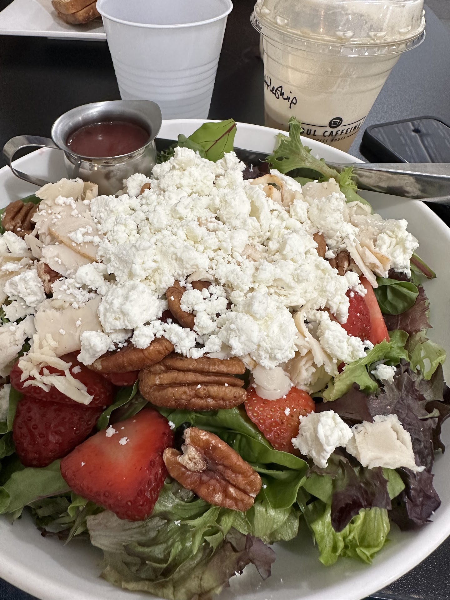 Ā Ā Ā Read moreFirst time here! Fantastic atmosphere. Cool vibe. Wood accents. Cozy seating area with fireplace. Additional room called the āgathering roomā has a table thatās by itself and seats about 6 people. Thereās a long bar in the dining area where folks were using their laptops. Smells divine in here. Coffee wafting in the air. Thereās a large chalkboard with a variety of breakfast and lunch options and delicious coffee options. I ordered the strawberry fields salad. Was HUGE with loads of berries, feta, pecans and tasty raspberry dressing. I got an iced mocha to wash it down. My guest got a half sandwich and the tomato soup. Both said it was delicious. Will...