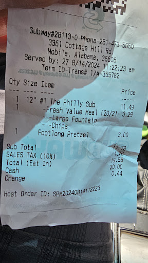 Read moreI came here yesterday afternoon, Sunday 3/23/25, to pick up a footlong grilled chicken sandwich that I had ordered online. It wasn't the best experience. First of all, I felt that the customer service could have been better!! Plus, I ordered to have my bread toasted. After I got home, which is not too far away, to eat my sandwich, I noticed my sandwich including the grilled chicken was COLD!! So I ended up having to heat the sandwich myself in my oven. Normally when I order this sandwich from other Subway restaurants the sandwich is heated or warmed. It's been awhile since I've been to this Subway on Cottage Hill Rd, however, I expected better. I'm so glad that I didn't include a tip with my purchase!!! A tip was HIGHLY...