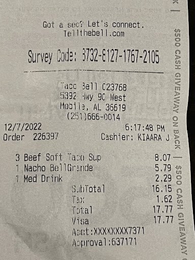 Read moreTillman corner location was very clean and unbelievable from a long time ago bc it would pass a white glove inspection and I may add the young color lady got my order correct and very polite the young men was also, my order came out fresh & hot meal & the young lady washed her hands several times bc she was doing a wonderful job on mopping the whole dinning area with hot scalding water and something in the water for disinfectant, she even changed the water just in a small are of dining area... i was amazed how clean and presentable the Taco Bell was at this location. I can say I will be back even if prices is little bit high but so is cost of living unfortunately, I had her name written down but had lost it but never less I surely wold recognize her once again.. this was back several weeks ago around the 2nd or 3rd bc that was on my pay day.. they worked hard and with pride and if all business had employees like was there on that Night shift every business owner woul some how greatly appreciate there employees.. Hopefully i see Taco Bell soon and Thanks for everyone's courtesy at my visit...