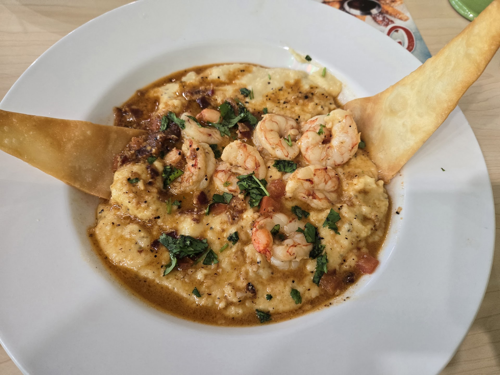 Food 6/10: The presentation of the food was amazing, everything looked absolutely perfect like it was out of a magazine. We ordered the shrimp and grits. The Taste was ok, they were seasoned well (a bit too much in spots). The grits we received were very lumpy. It's fine to see a lump or two but our entire meal was lumpy (10-12 lumps per plate). I don't know if this was just a bad batch but either way this was my first experience. The shrimp on top of the grits were lackluster. They didn't appear seared or anything, they tasted like they were warmed and put on top last minute. A bit disappointed because the taste didn't match up with the appearance. Next, I ordered a side of blueberry doughnuts 6.5/10. They looked amazing as expected. They tasted like blueberry cake doughnuts which is good but they were a bit dry. I know they were deep fried but I wish they didn't taste so dry on their own. Maybe my batch cooked too long. The blueberry sauce that came with it wasn't as expected. It tasted like store bought jar sauce and was served at room temp. Maybe warming it would help but definitely didn't taste homemade unfortunately. Note: the shrimp and grits have cilantro sprinkled on top which I dislike. If you aren't a fan of cilantro then be sure to tell the waiter. I didn't subtract this from the rating but would have wanted it without it. The waiter didn't return in time as I mentioned before so I worked around it and took off as much as possible.
