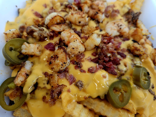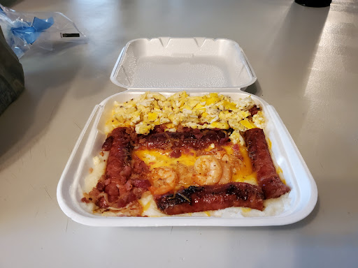 Read moreWent here after 12 noon wanting breakfast but ready to order lunch. I was overjoyed to find out they sell breakfast all day! They serve wings, loaded fries, loaded nachos, burgers, fish, and more. I got the breakfast bowl. Which is beyond a bowl. It comes in a to-go box without sections. I ate 5-6 shrimp from my plate on the way home. No worries because it was loaded down with shrimp, scrambled eggs, real bacon crumples, conecuh sausage, and cheese grits. Taste before adding salt. The only reason I gave 4 stars instead of 5 was for the wait time. This is a stationary food truck. However, there are tables with umbrellas to sit at while you wait, that's if you don't want to sit...