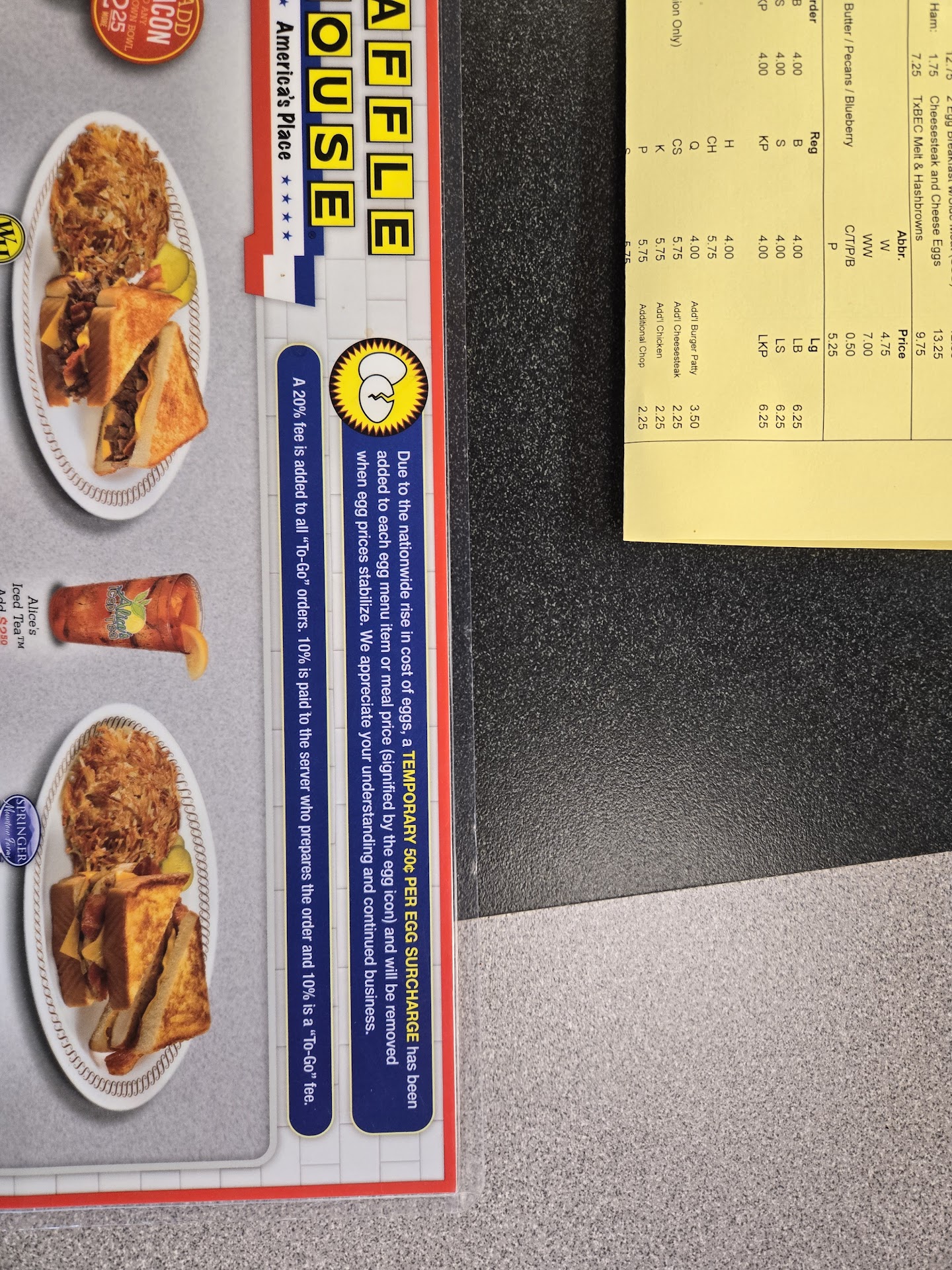 Read more4/2025 The fact waffle House has published a new menu with the temporary egg charge on it says they have no intention of making not temporary. On top of that the eggs I did get were way undercooked. Guess I'll check back a few years later to see if this establishment can change.