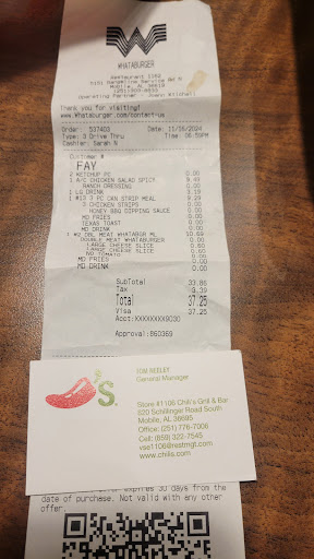Update 3/24/2024 This place is ridiculous. I just waited 35 in the drive thru lane for a burger, fries, a fish meal and 2 drinks. To start with there was only one car in front of us and all they ordered was a drink, but they sat there for 10 minutes waiting on that drink. Then once we got to the window, the girl told us our order, but it was incorrect. So we corrected it and then waited another 25 minutes for our food. Now I'm trying to eat it and of course it's wrong. They gave me a fish sandwich instead of the two fillets I ordered. On top of that, it's disgusting. It tastes like the fish soaked in onion juice for weeks . The fries are so salty I can't eat them either. So once again, I basically gave them money for nothing because I can't eat any of this trash. It's going straight into the dumpster. This is the last time, and mean it, I will ever waste my money at this Whataburger. They consistently give bad food and bad service and they don't do anything to fix the issues. Heck, they don't even reach out when u complain and try to give any type of apology. They just seem to sit back and laugh at u for being the fool for spending ur money there in the first place. Well never again for me and my family. I rather drive an hour to Saraland to get my Whataburger fix, than ever have this one cross my mind.