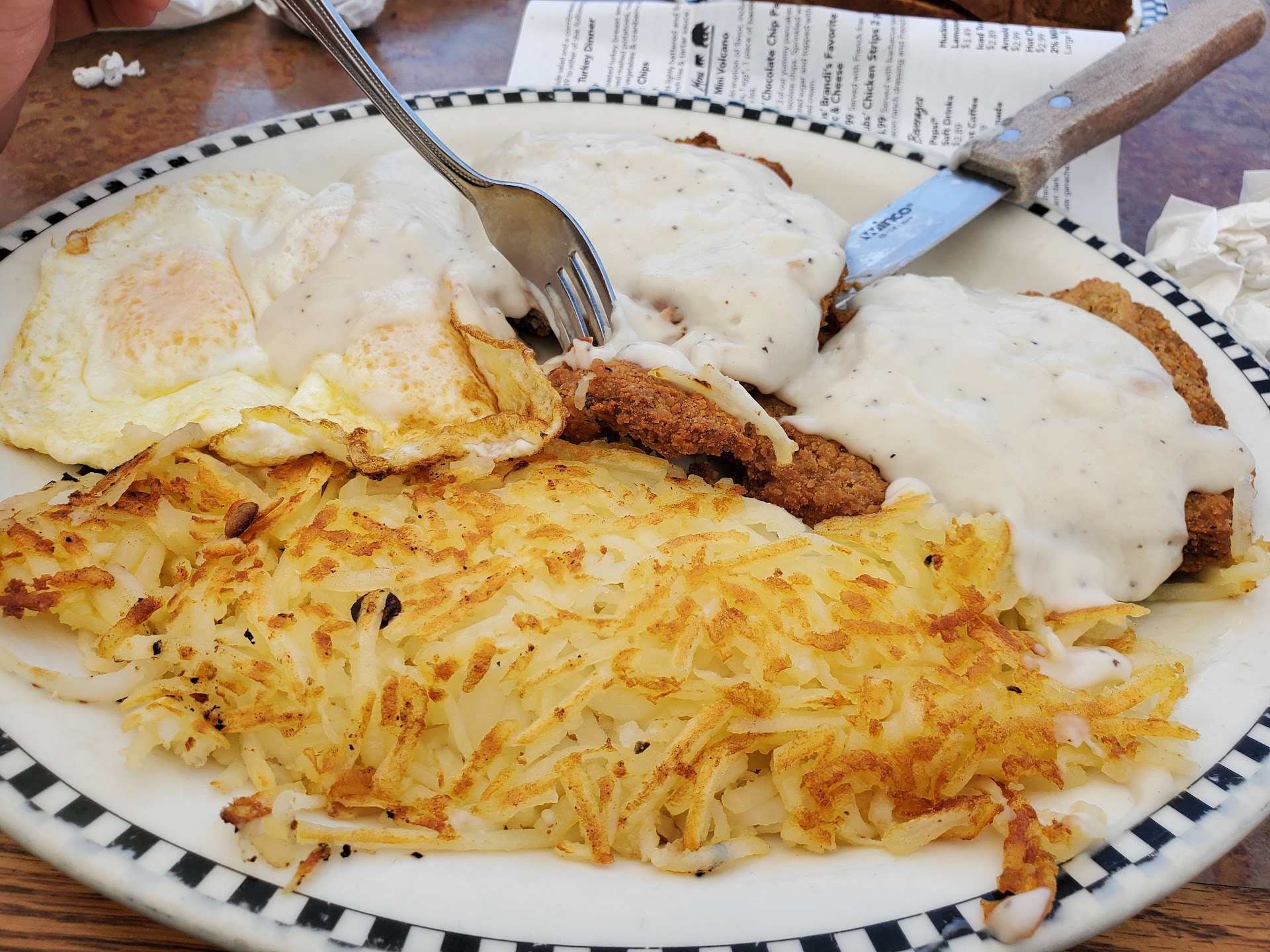 The only thing that prevents me from giving it a perfect 5 is that for over a year they have been advertising fresh orange juice at fresh ok prices but serving concentrated grocery store instead.they told us the machine for extracting fresh is broken.thats probably illegal to say you're serving one thing when you're serving something cheaper but similar. They could stroll on over to Winco and get fresh squeezed in about 20 min.since it's right across the parking lot. Aside from that, their food is generous, tasty, hot, everything you would want in a family style diner. The service is fast very friendly. The dining room is comfortable from seating to air temp, and the restrooms are without fault. The prices are better than expected considering even fast food is way more expensive than previous years. We had breakfasts, and each one was big enough for 3 people...two platters for each person. The country fried steak was almost as big as a dinner plate and served on a big platter with eggs and exceptional red potatoes with bell pepper and onion. We were given lots of napkins,butter,syrup. The menu is varied and we didn't really read it all, but I know there's so much to choose from, you could have a meal or just a snack or dessert or shake. There's bound to be something to suit everyone.