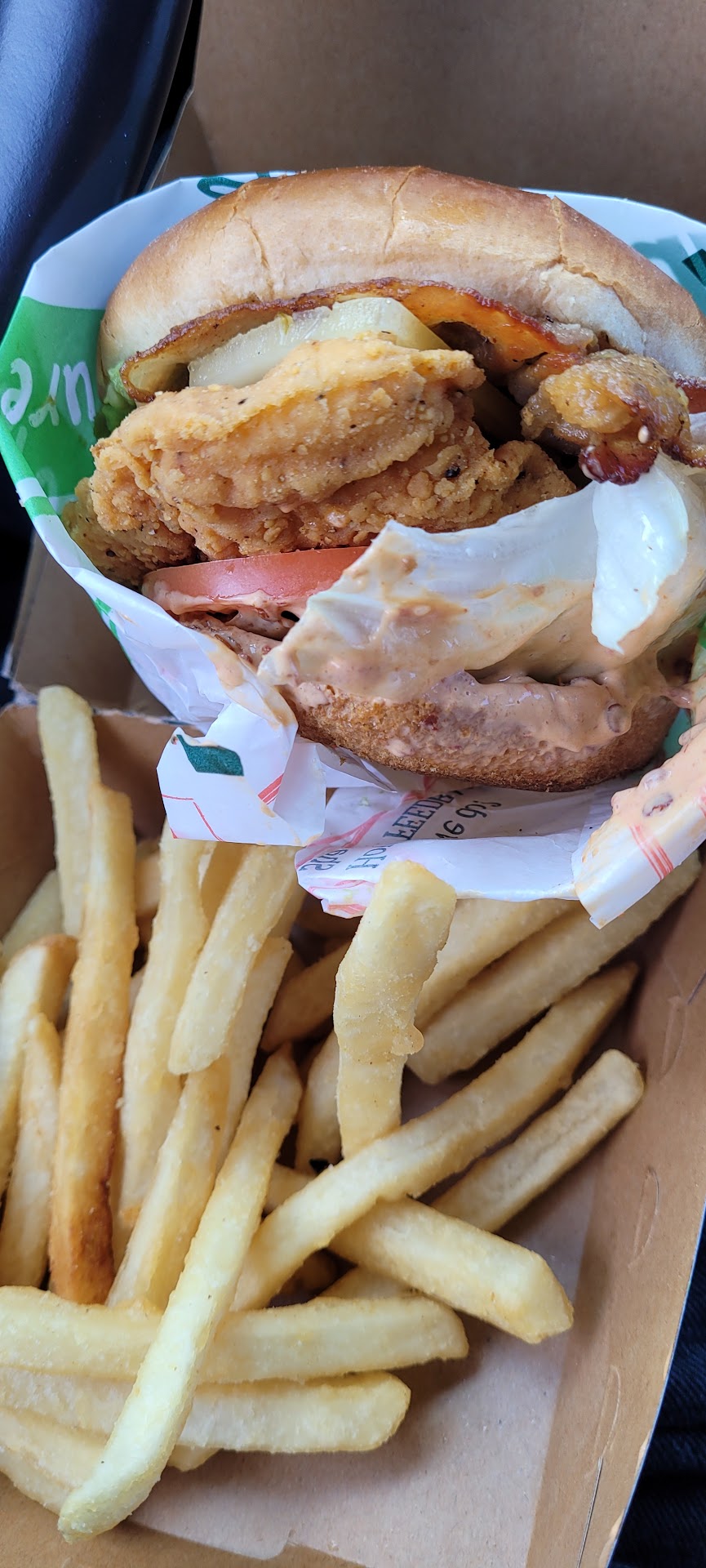 Read moreHad lunch here, expecting food on a par with a Carl's Jr. Instead, we were very disappointed. The food looked good--but it really wasn't. Thin, flavorless sauce dripped out of the bottom of the burger when it was picked up. The burger had no wrapping, which made it worse. Some of the meat patties were undercooked, the kind of careless circumstance that has contributed to the spread of things like listeria infections, which can and do kill people. The burgers weren't flavorful, either, they just seemed under-seasoned and blah. Their "ever-crispy" fries were certainly that, but they stayed crispy because they were dried out. Tastes differ, so they might be just what someone else loves, but I prefer fries that are just crispy on the outside but soft on the inside. Narrow fries can achieve that perfect balance. Their onion rings were HUGE, like half an onion in size, but disappointingly in flavor, the onion disconcertingly tough and on the slimy side, squeezing out of the ring when one took a bite. The batter was tasteless. How can fried food be tasteless?! Sadly, there were no redeeming features to this meal, and we won't be...
