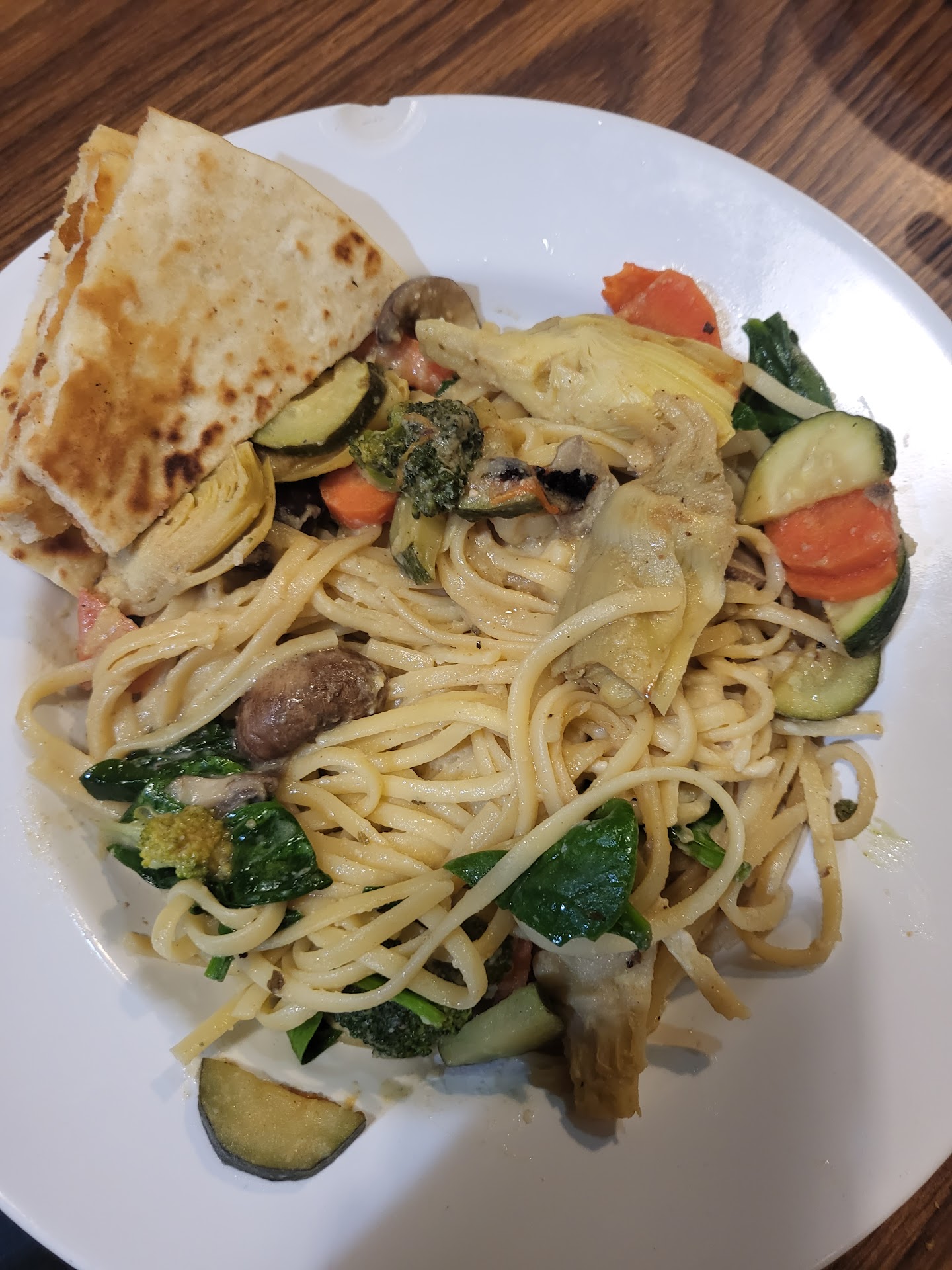 Excellent food and service! We had the holytizer and spicy shrimp appetizers. The baba ganoush had a ton of flavor and the hummus was equally as tasty, it had a super creamy texture and was definitely made fresh; it came with 2 falafel also. My bf enjoyed the flavors of the shrimp, it had a nice red sauce with a mild flavor. I ordered the artichoke pasta made vegan, which substituted the cream sauce for hummus. It was loaded with freshly cooked veggies including tons of grilled asparagus. You could tell the veggies were good quality (fluffy mushrooms, nothing tasted canned or frozen) and I was very impressed with the portion size. My meal included a choice of salad or a soup (there were 2 soup choices), I chose white bean and it tasted homemade and had nice large chunks of garlic cloves. My bf had shrimp pesto and he said it was excellent as well, it came with a ton of sauce which I think is a plus. He chose the house salad as his side, it had a lot of ingredients, it was not skimpy. The restaurant and bathrooms were clean, the artwork on the walls (murals and paintings) are unique and nice to look at. The theme is very present. The service was great, staff was friendly. There was only one chef cooking from what I could tell and she did a wonderful job keeping everything coming up hot and quickly, despite them being pretty busy with to go orders. We will definitely make this one of our date spots from now on. There is wine and beer as well. All of the food was impressive, well portioned, and...