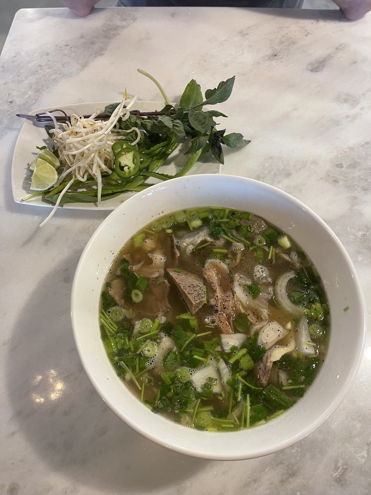 It came with the traditional toppings on the side: Thai basil, bean sprouts, lime, jalapenos, and an herb we hadn't seen at other pho places that was pretty good. Hubs says the jalapenos are very good and quite strong (and he likes Thai spicy). For new pho fans: There were some larger pieces of cartilage in the soup (you can pick out if you aren't big on the texture).