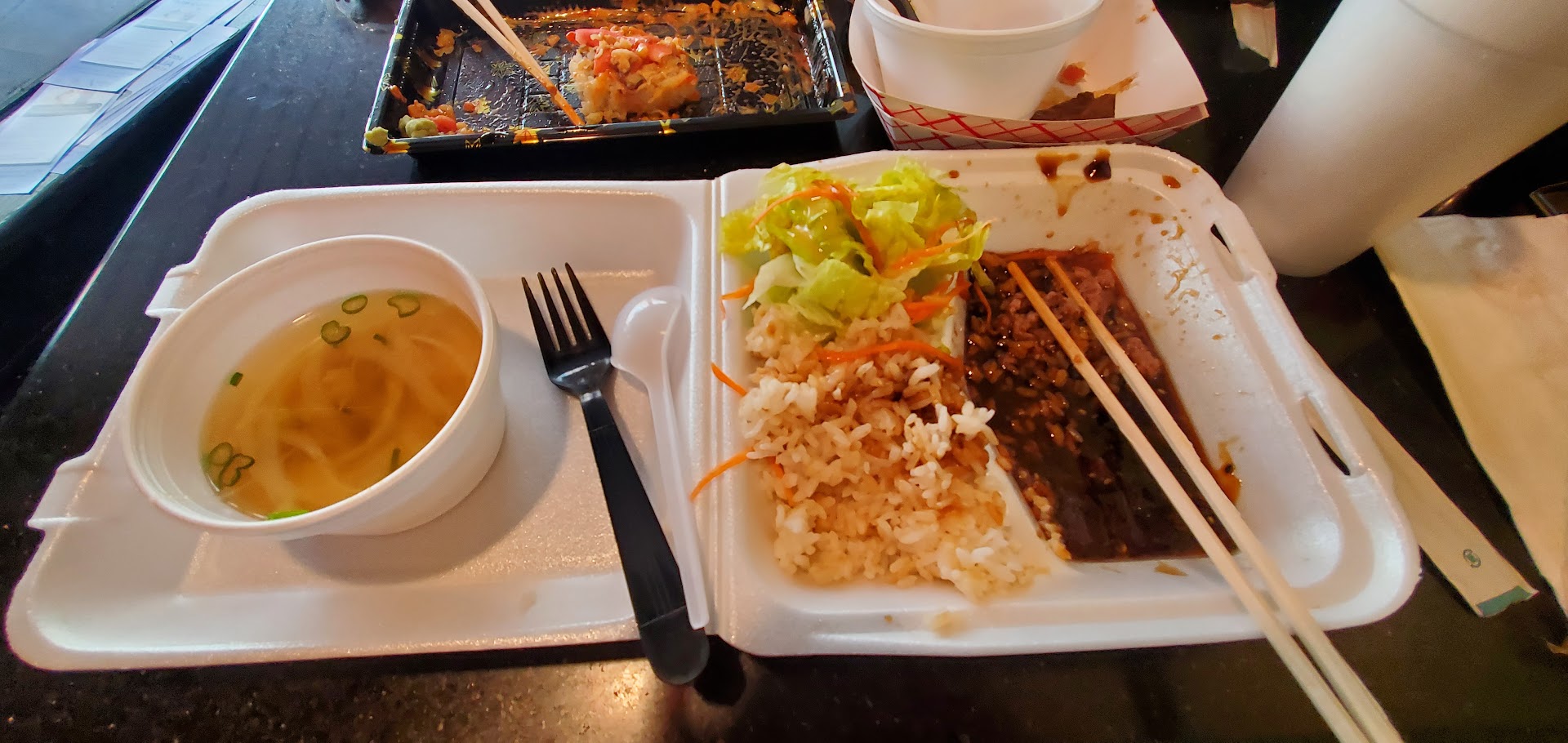 The restaurant was dirty. Nothing looked organized with stock overflowing from boxes left at the front of house. The dead bugs on the windowsill had been there so long they collected a few good layers of dust. After receiving our food, I noticed that everything was served in either a styrofoam, paper, or plastic container. Hot miso soup in styrofoam, my friend's sushi rolls on a plastic tray, and my meal conveniently already in a to-go box. No one is on dish-duty at this restaurant because there are NO dishes.