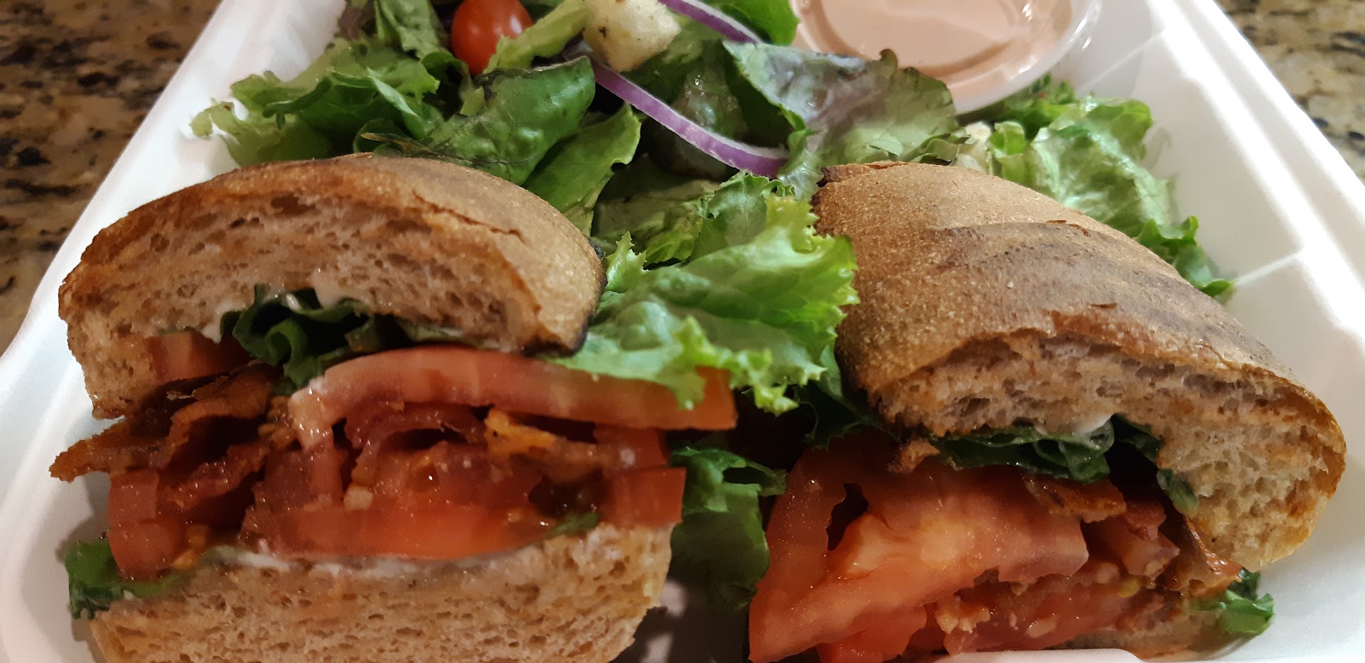 This will be a "Order to go" food review. At 107 degrees outside today I wasn't cooking tonight, so I stopped at the Velvet Grill and Creamery and ordered a light meal. Today's order was the "BLT" or commonly known as "Bacon , Lettuce and Tomato" and I switched from Fries to a salad with Thousand Island dressing on the side. First off, the "BLT" was delicious, this was on their baked wheat bread bun, the juiciness of flavors of the Bacon merging with the Tomato was just party and the salad was just right. To end the meal was their fresh brewed Ice Tea. This hit the spot. As usual the service was fast and courteous even for take out. Stop on by, their food is great, and if your a Military Veteran they give a discount with ID. Enjoy.