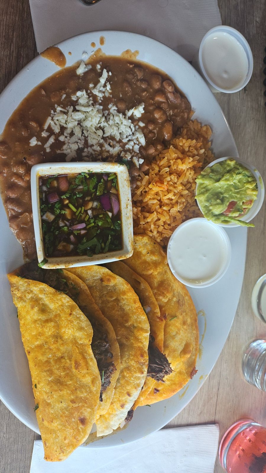 First off I did not sit in and eat I just ordered to go but when I walked in the place was cute and very clean. The customers sitting at the tables had different yummy mixed drinks that Iām definitely gonna have to come back and try. The staff was super friendly and welcoming even gave my daughter a candy cane. I ordered the quesoBirria taco dinner to go. The nice hostess said it would be 10 minutes so I went down the street to oberweise to pick up some eggnog then drove back. I called and the lady on the phone said they were just wrapping it up ,with that being said I sat in my car for a few minutes before I was ready to head in and get my food but I didnāt need to because a nice gentleman who work there Iām unsure if it was the owner or not, but came out with my food to my car which was totally nice of him! Now for the food. The rice was kind of bland and dry not a fan. The beans were not bad has flavor. Now the quesabirria tacos were tender and had good flavor just wish it had a little more of a kick as far as spiciness. They didnāt add any salsas which was a bummer. The price for the dinner and keep in mind I added an extra taco was around $31 for one person. Over scale 1-10 I would give a 7 definitely would like to try the mix drinks given I...