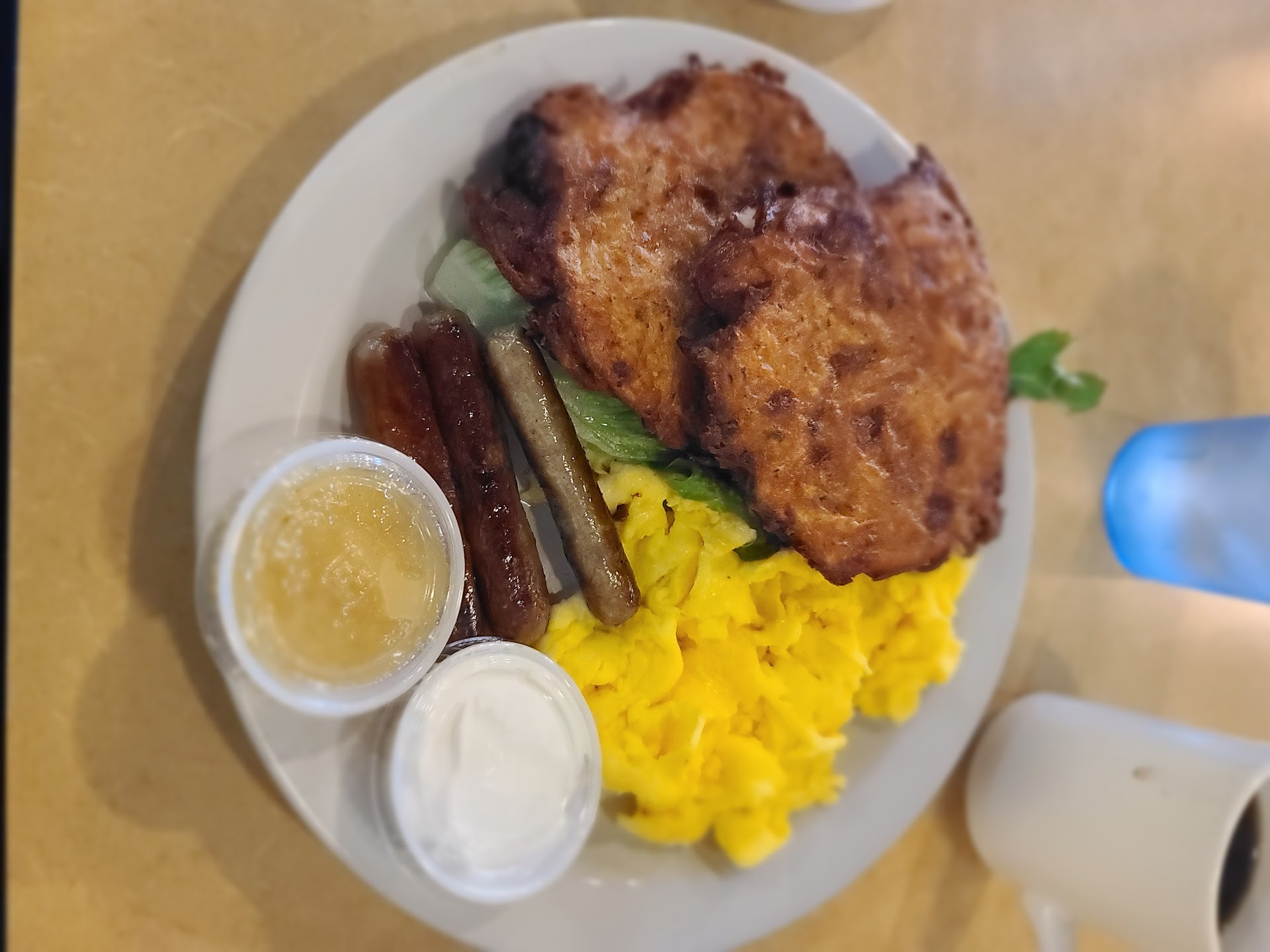 We loved this so much, we came back again before heading back home today. My potato pancake order was as good as yesterday, a great sign of good cooking. My wife ordered 2 carrot cake pancakes. Made with walnuts and topped with a drizzled icing they were enough for 2. Link sausage and eggs were cooked just as ordered.