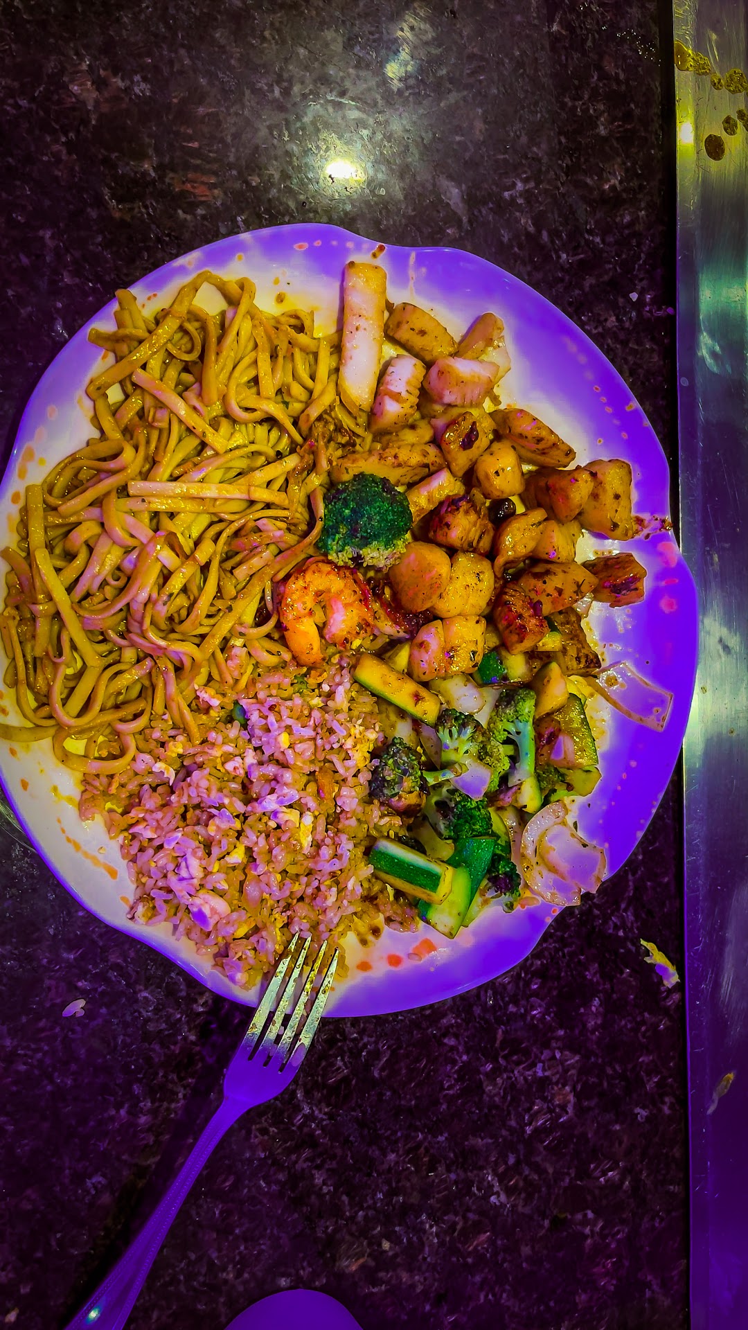 The filet was well cooked and the flavor was great. That may have been because it was one of the few things that was not covered in this compound butter the chef put on almost everything that touched the grill. The rice, noodles, veggies, chicken, shrimp... all had this same butter on them. The overpowering flavor was very noticeable especially on the noodles that got little other treatment other than the deep orange butter.
