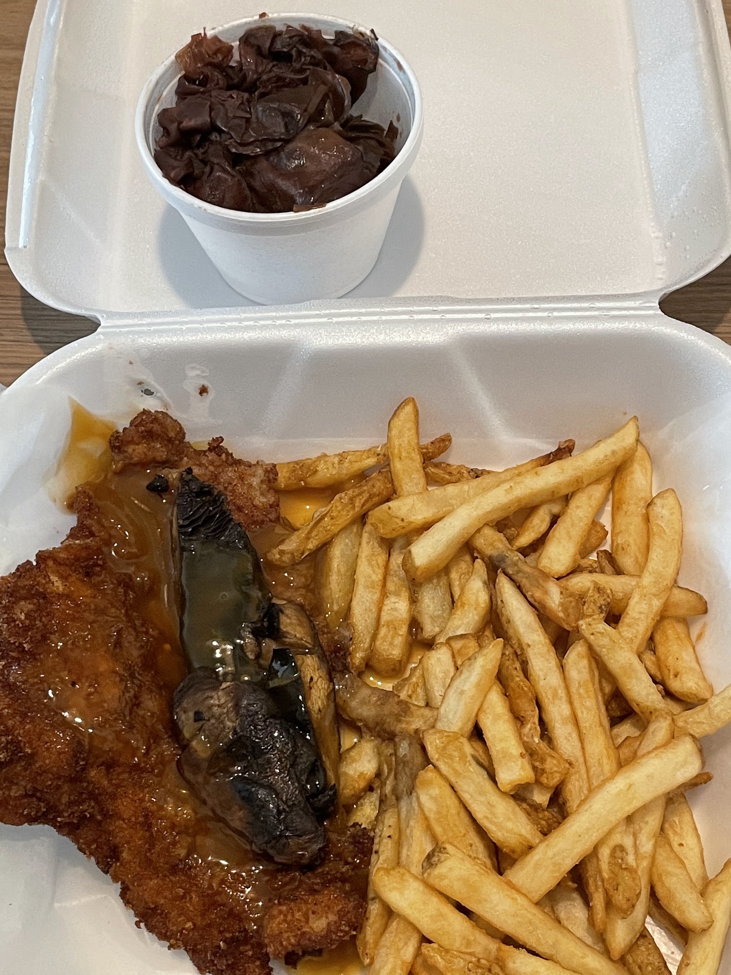 We all ordered the schnitzel, 3 of us got it with spätzle and potato salad, and my stepdad got it with potato pancakes, and I believe red cabbage. The 3 of us asked for the gravy on the spätzle instead of the schnitzel.
