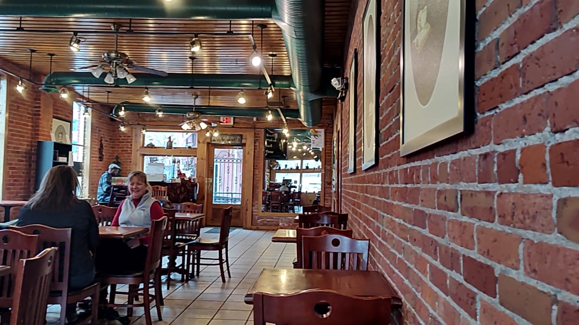 The space clearly has a carefully cultivated appearance. The dead poets theming is obvious on the surface - portraits of various long deceased authors of verse line the walls and the menu of specialty drinks bear many of their names. Beyond this, however, the furnishings and other architectural features provide additional depth to the experience. All of the walls in the space are simple brick and mortar which appear to be original to the space prior to it being a coffee house. The ceiling area has other distinct aesthetics, including stained and finished 2x4s throughout, HVAC ductwork painted a muted green color, and a mix of accent lighting from drop fixtures and somewhat ornate ceiling fans. The whole of it comes together to give the feeling that the coffee house might actually come out of mid-19th century Moline. It's a neat feeling - everything looks old, but clearly isn't and is, in fact, well kept up and clean.