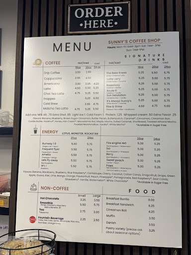 Read moreThis was our first visit to Sunny’s & we can definitely say we will be returning soon! Super warm & inviting environment, with a slight industrial feel. A few cute couches/comfy chair seating areas were really cozy. This place had great menus- a lot of seasonal drink options as well as a good list of their most popular drinks. The coffee was really great! Good tasting espresso, really smooth, sweet but not overbearing. Really good cold foam. I got their seasonal Coconut Kisses iced Latte & it was topped with actual toasted coconut which was delicious! Best coconut latte I’ve had for sure!! We also got a blueberry muffin, a breakfast sandwich, & a breakfast burrito, all of which were just delicious! Great food, coffee, baristas, & atmosphere. Oh; also, everything was SO CLEAN & organized. I was impressed with the...