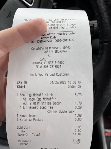 Read moreStopped by today to get two fish sandwichâs for five dollars. Wanted to make sure they were still doing this so I looked at the front window. The poster said, âtwo fish for five dollarsâ. So I walked in and placed my order, the cashier says eight something. I said the sign in the window says two for five. She says, âoh that ended yesterday, we havenât had time to take down the postersâ. Well I ask for the manager thinking heâll want to make it right. He says the same thing, ended yesterday didnât have time to take the sign down. I said, âwell the signs up so how about giving me that price. He says no and walks over to take the sign down. There wasnât more then a few people in the restaurant but still they didnât have time. Just another reason why people arenât going to McDonaldâs as much anymore. Went down the road to Arbyâs, wow two fish for five dollars. The piece of fish was twice the size and the bun was great. Goodbye McDonaldâs, Hello Arbyâs!! Just read all the other terrible reviews about this place, Iâm surprised McDonaldâs doesnât take away their franchise. Going to the corporate level with my complaint, too busy to take down a few posters. At least five people were standing around and it was four in the afternoon. Lazy, uncaring people...