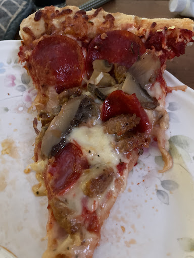 You get sausage green peppers. Onions. Pepperoni and mushrooms. They don’t add a lot of sauce which I love bc I’m not a big red sauce guy. Also they are not skimpy on the toppings