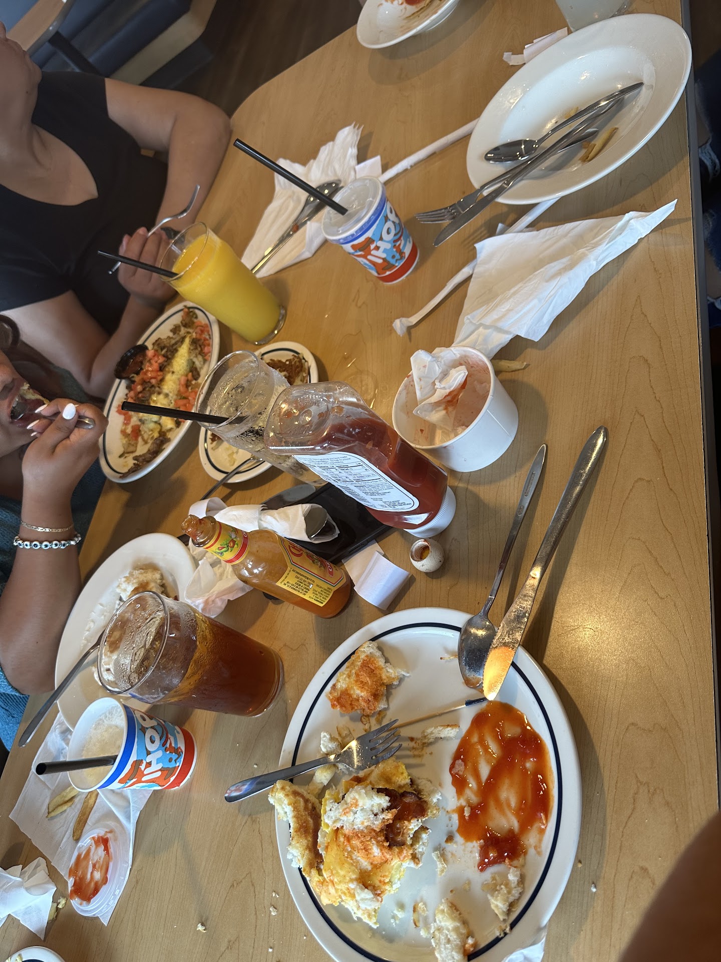 To top it off, we noticed a nearby college student struggling with his order. He had gotten the Pancake of the Month (a chocolate-flavored one), but after a few bites, he left about three-quarters of it untouched—probably because he didn’t enjoy it.