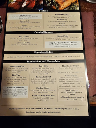 Read moreIt's been many years since I've been to this location, and I left tonight's dinner pleasantly surprised. I was surprised because I enjoyed the food. I was surprised because, in my opinion, the food was high quality and reasonably priced. The parking lot was packed when we arrived at 6:15 p.m. for our 6:30 p.m. reservation for six. We we're happily greeted by the hostess and sat immediately, zero wait time. The interior is cozy, not very big, but they do not have the tables close together, so you do not feel like you're being packed in on top of the other customers. All entrées come with their salad bar. For me, it's been many years since I've been to a restaurant that had what I consider a "classic 80's/90's" salad bar. True to the description on their menu, every on the salad bar was fresh. The lettuce was crunchy and firm, and there were many of the classic toppings such as whole hard-boiled eggs, beets, chopped olives, pasta salad, potatoe salad, and more. Five out or party of 6 ordered drinks from the bar prior to selecting our entrées. We had a total of 4 steaks, 1 order of pork chops, and 1 order of Bar-B-Q ribs. I ordered a 16oz Ribeye medium temperature, Oscar Style. I enjoyed every bite, my steak was cooked perfectly, the Crab meat was plentiful and fresh, and the hollandaise sauce was tasty. Everyone else told me they were very satisfied with their meals, no complaints just complements about their dinners. I ordered cheesecake and one of their specialty coffees for dessert. Others at my table ordered peanut butter pie and creme brule. My cheesecake was not homemade. I could tell it was from a box by they way it was cut, the taste, and the texture. It wasn't bad, but I wouldn't order it again. I got favorable reviews about the other dessert orders and those of us that ordered coffee we were satisfied. Our waiter was professional and knowledgeable about the items on the menu. He wasn't overly friendly or talkative, but for me, that's not a necessity. As I said earlier, we were sat at 6:15 p.m. and our meal was concluded at 8:30 p.m. I was happy about the total length of our dining experience because it was a night out with old friends, and he had ample time to talk. I do recommend you make reservation if you are planning to go on a Friday,...