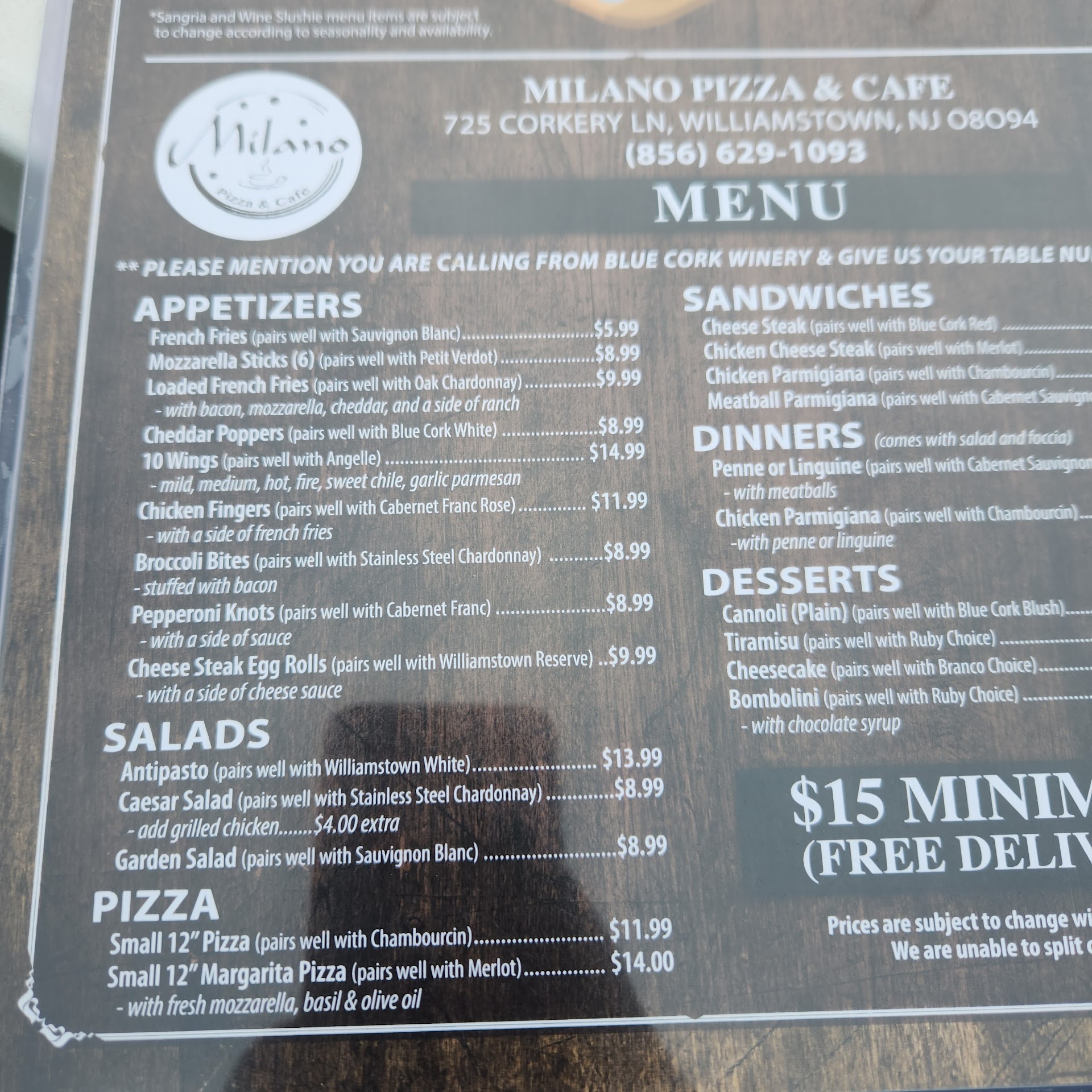Read moreMe and party of 8 were at the Blue Cork Winery and we ordered food from the Milano menu. Over $100 worth of food. We ordered 2 ordered of pepperoni knots. Upon delivery they gave us 2 order of garlic knots. We called and told them that we didn't order garlic knots and that was not even an option on the menu. ( see picture) The waitress tells me that she read my order back and she said garlic knots. I responded and said no you said pepperoni knots. The manager then gets on the phone and said that he was standing next to her when she read my order back. Like really you just so happen to be standing next to her which was over 30 min when she read back MY order. ( yeah right) I then repeated again that it wasn't even on the menu and that she read back pepperoni knots. He said we had to pay if we wanted what we actually ordered. Then the icing on the cake is because Blue Cork partners with them we told the manager and she said oh I'm shocked they would do that. However, she did not make an attempt to make it right either. The thing is as a business you should make it right with your customer. The pepperoni knots were literally $8. So 2 business had the opportunity to make it right and neither of them did. Although I can't prove it I believe if we had been white both business would have made it right. I recommend no one gives business to either...