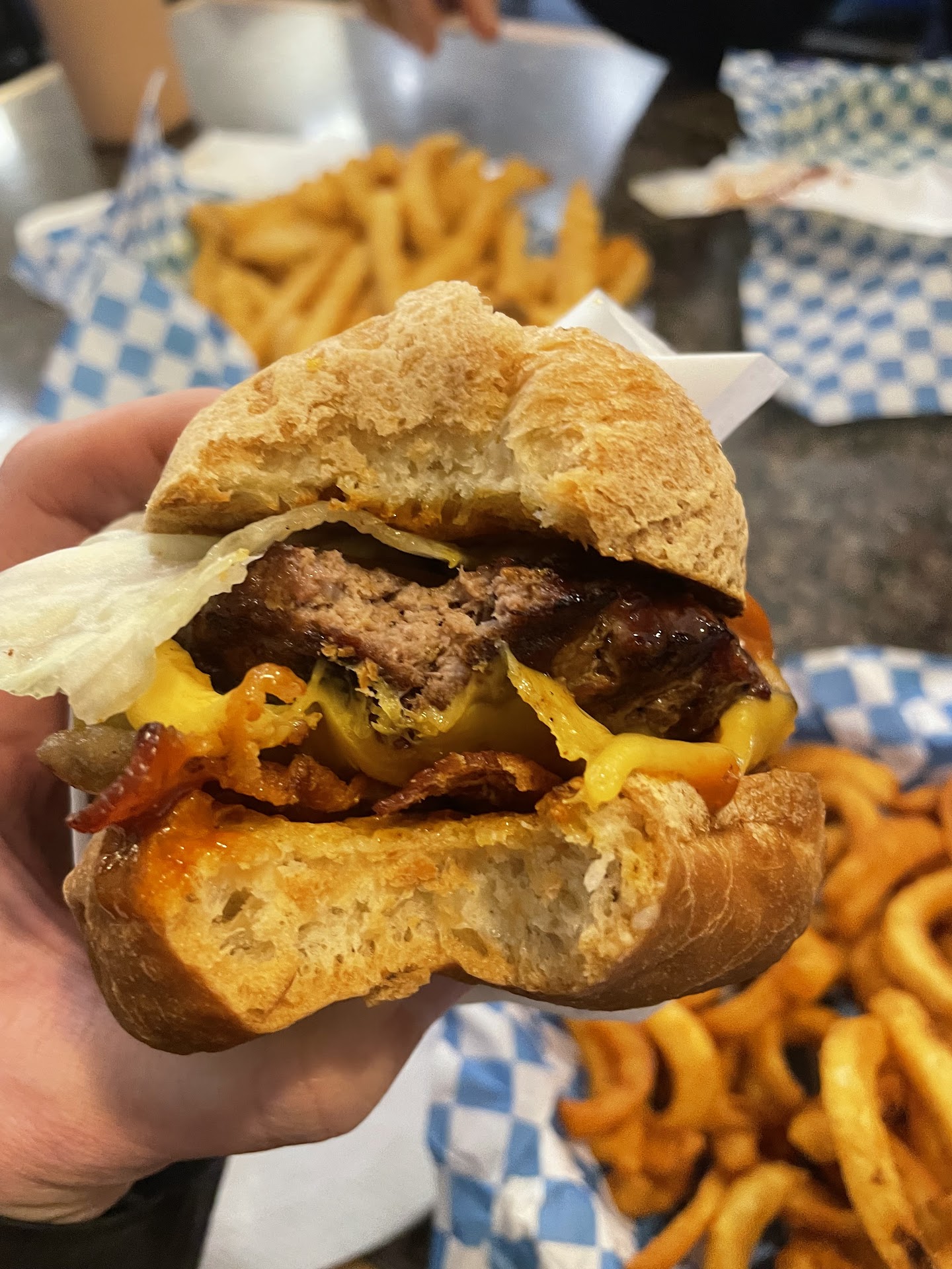 Read moreCame in 15-20 minutes before close. Ordered a few fried, ABLT, Blue Cheese, and a peanut butter shake. Walked out around 7:15, a ~30 minute wait with several people in line in front of us. Service was nothing special, but employees were kind, and even gave us an extra fry for free since it would’ve gone to waste. Fries are crinkle cut and served pretty cold. The ABLT was overall delicious, it had a lot of bacon and the right amount of mayo and lettuce. However, the avocado was extremely unripe and had to remove it from the sandwich. My partner tried the Blue Cheese burger, and was surprised to discover it doesn’t contain a sauce but mostly salty cheese chunks which might be appetizing for some. Overall, I probably wouldn’t go again. This is my second visit, but would be willing to give it...