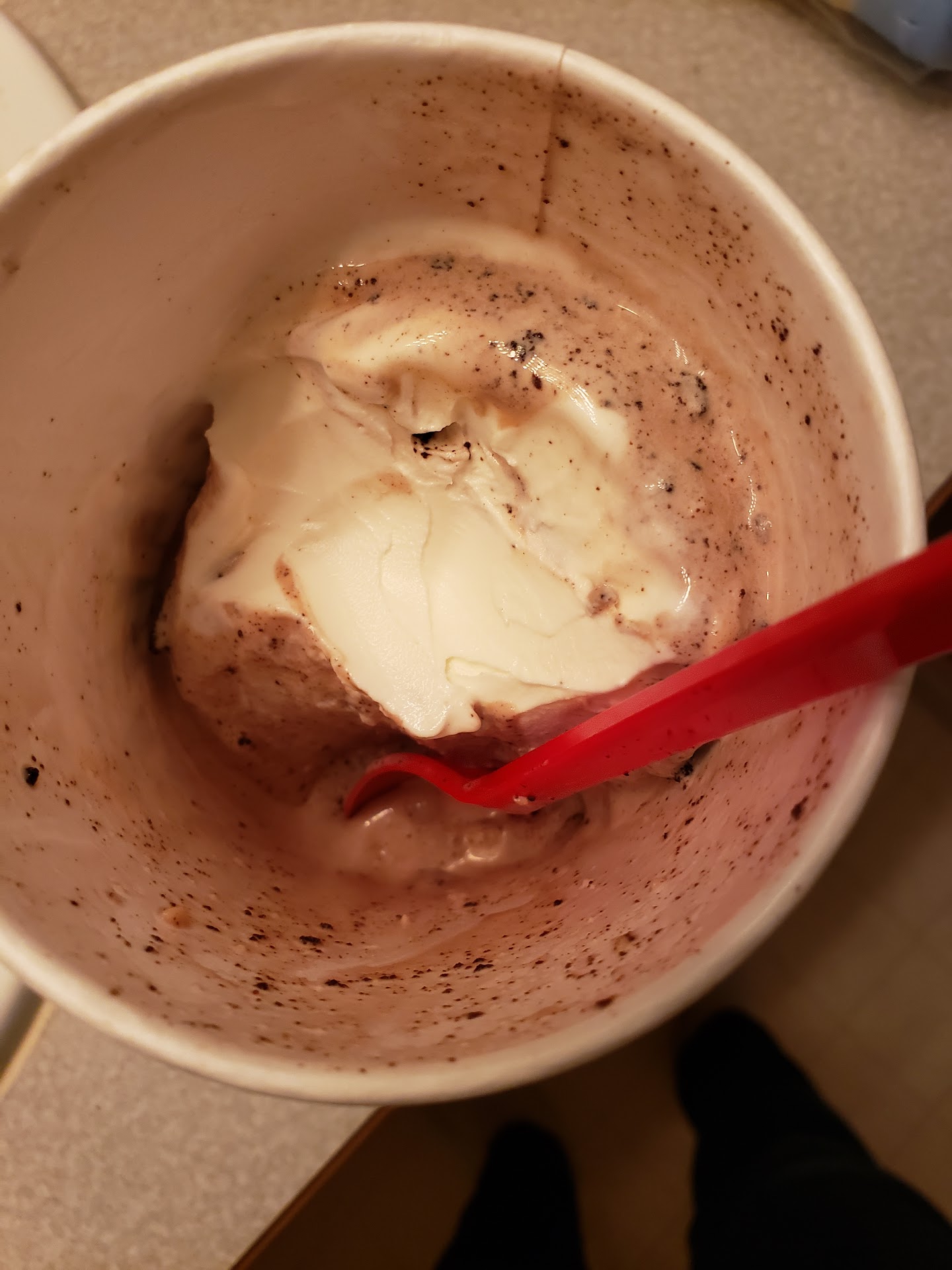 We ordered (2) 3-piece chicken strips (6 total), but got (2) 2-pieces (4 total). The pretzels weren't the best we've had but fine. We also got a drink and a small blizzard. When they tried to hand me the blizzard, it had melted ice cream running down the side in huge, gooey drops. We asked them to clean it up before it got to our car, and he did. He handed it back over and the ice cream was soft and melty. I asked them to remake it and a long time passed. Eventually the employee came back and told us they were out of chocolate ice cream. No wonder it had looked so bad - it was the very last bits in there. He asked if it would be okay to use vanilla and add chocolate syrup and that seemed to make sense to me so I said yes.