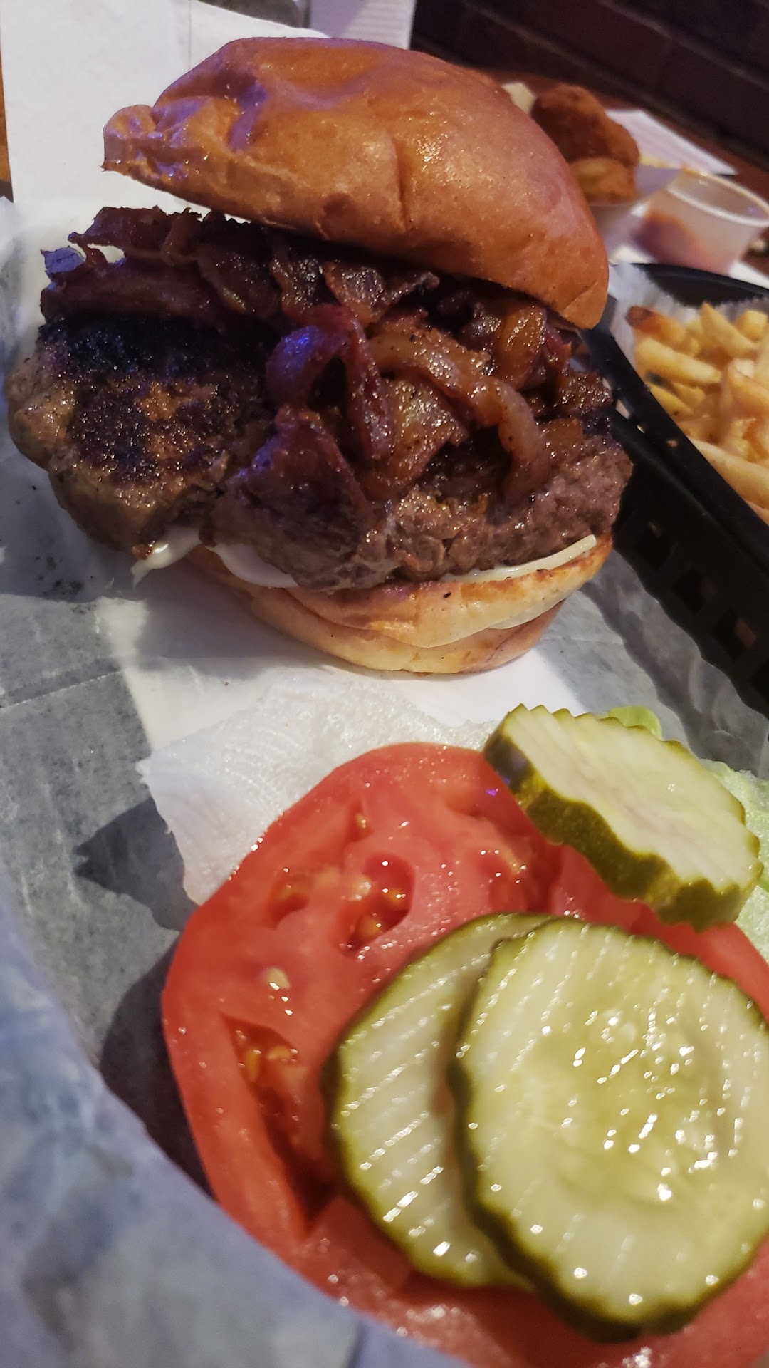 Read moreUsually a pretty decent place to get a burger but tonight was a no go. Waited an hour for food to come out. Meanwhile we watched another table who came in after we did get multiple baskets of food and drinks ahead of us. We asked for our food to be put into to go containers since it was nearing 10:00 pm and we were met with an extreme amount of poor attitude from the female cook with long grey hair. Our boxes were slammed against the counter and then thrown onto the bar when bagged up. Words were mumbled under her breath about us as she boxed our food up. Beware.