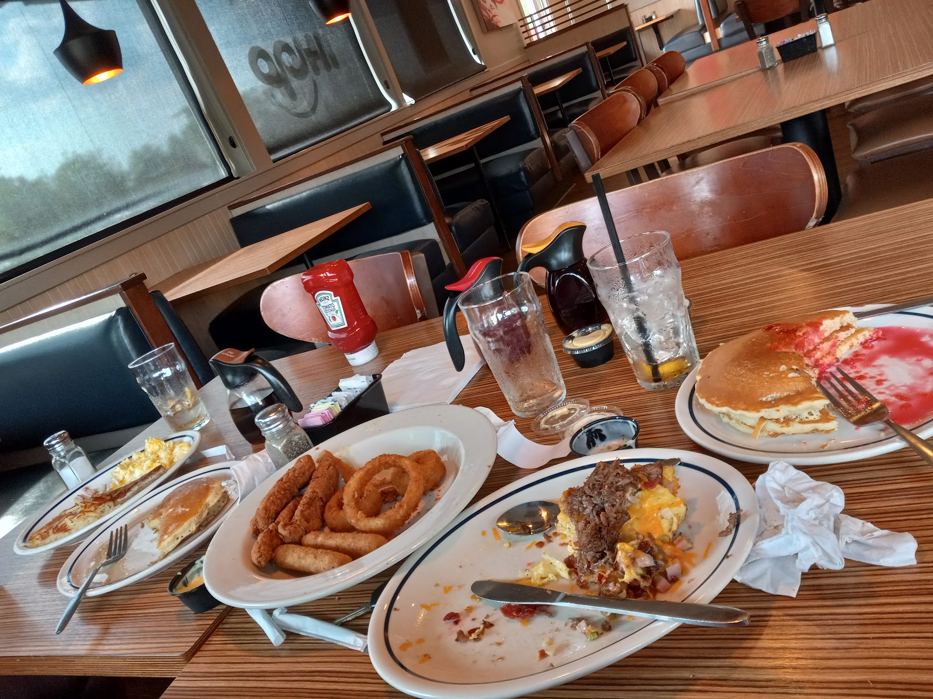 I was there for over an hour and the table next to mine needed busing, it stayed that way until about 5 minutes before I left, by that point 6 more tables sat needing to be bused. I had over easy eggs, waffles, hash browns, & bacon. The other guest at my table had the same except she had toast instead of waffles. The hash browns were undercooked as was the bacon, the bacon being unbrowned and barely cooked enough to be healthy to eat, as a matter of fact, I'm not certain that it was; it was rubbery and the fat wasn't rendered at all. The egg yolks were runny as they should be for over easy eggs and the whites were completely set. Typically I would have said the eggs were pefection except for the fact that the whites were browned and crispy, resulting in whites which were too tough to cut with my fork and barely able to be cut with the aide of the knife I had. The server I had gave me the distinct impression she would rather have been elsewhere; not all of the servers appeared to feel the same as I observed one in particular who was very attentive to the guests at his stations, too bad he wasn't my server. When we went to pay the check, my server rounded the corner with her hand out and remained that way not saying a single word as she waited for me to place the funds into her hand after which she still said nothing. I have to say that this was the absolute worst dining experience I have ever had at any iHop location. Too bad, I likely won't be returning to...