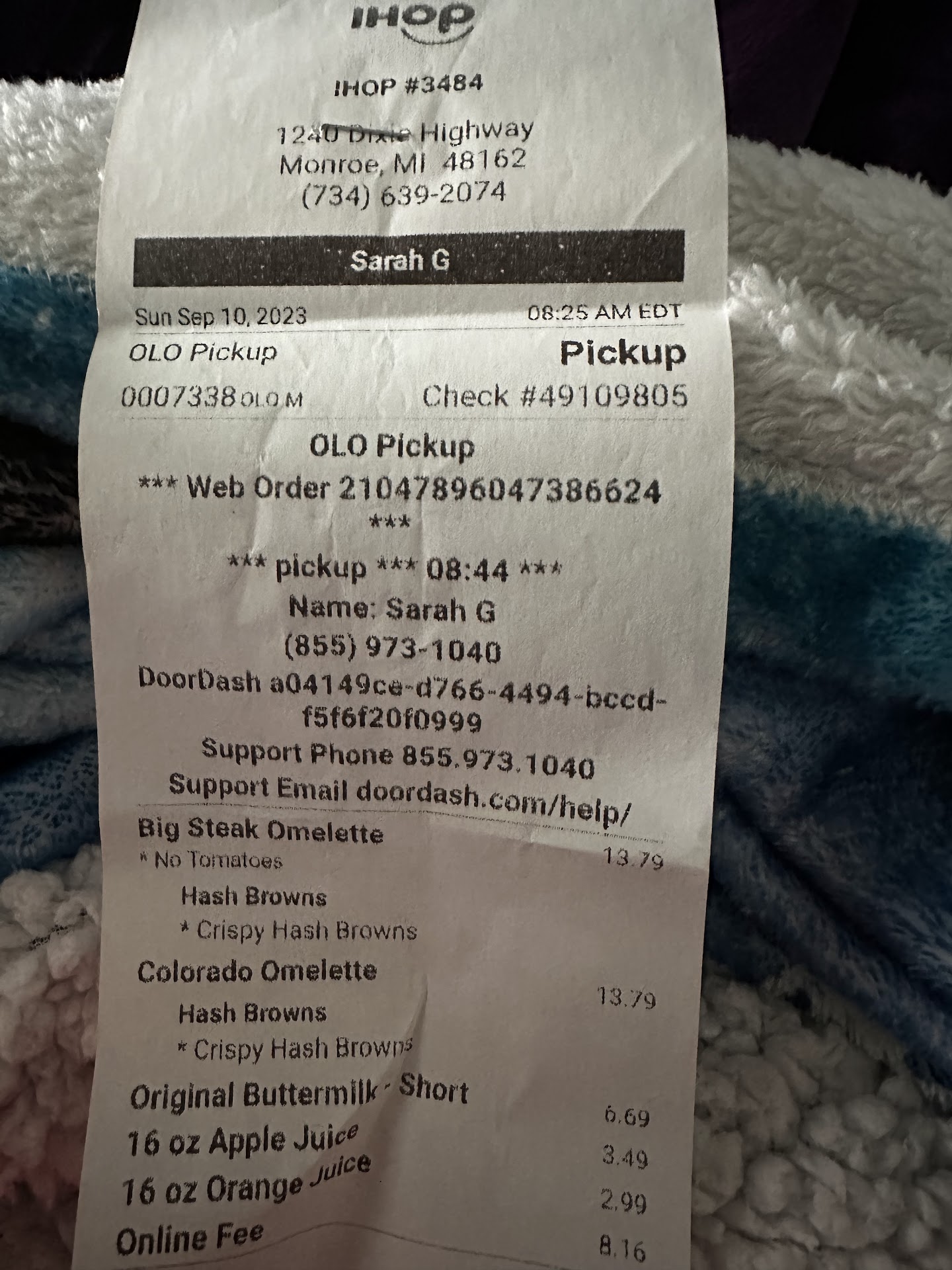I ordered three items. One item was a short stack of pancakes, an order of chocolate chocolate chip pancakes, and an order of cupcake pancakes when I receive the order through DoorDash which is another issue the pancakes were well below what a standard fluffy pancake should look like and the whip cream and condiments were melted all over the inside of the bag. When I called and spoke to the manager Melanie, she was very defensive even though I tried to explain to her that this had been an issue numerous times with my orders through this particular IHOP and I really just wanted to let her know how inconsistent and how terrible the product that they were sending to me was. Next as I try to explain, she continue to argue saying it wasn’t IHOPs problem, and before I could just let her know that I really wanted nothing but to let them know that they needed to have a better representation of their company and their product. She told me a call somebody else, and when I said, apparently, they didn’t care she said have a nice day and hung up on me never really offered any type of solution or satisfaction as far as apologies, but instead hung up. This is probably at least the third or fourth time I’ve ordered food from IHOP in Monroe and it has been absolutely terrible!!!! Always missing items and pancakes supposed to be fluffy flat and tiny by size and portion. Apparently their standard at IHOP is 5 1/4 inches or something but I took pictures there’s nothing standard about any of these. We’re talking pancakes not rocket science thanks for another horrible experience, IHOP, and your management is even worse than your food. Have a great...