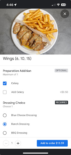 Read moreThis was my second visit. Again I ordered 10 wings mild with ranch , fries and a drink. $12.94. Again health rating as posted on this date 98%. Again the wings where not BIG as advertised in the front window but where average size and very tasty. I have eaten wings all over the country from NYC to LA and there "are" bigger wings. Ranch sauce was nothing special (out of a contains I suspect). Fries where much better this time. The restaurant was clean and friendly. All in all 7.5 out of 10. It was good. I will return. Stay safe
