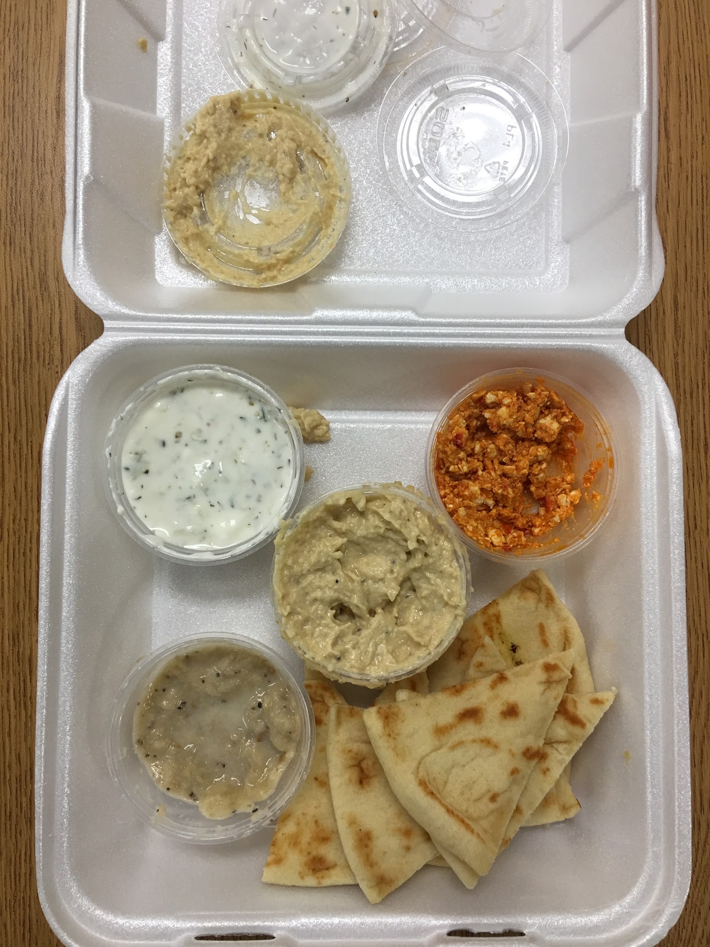 Very disappointed. I ordered the sampler platter with standard Mediterranean fares (dolma, baba ghanoush, hummus) and a baklava to go.