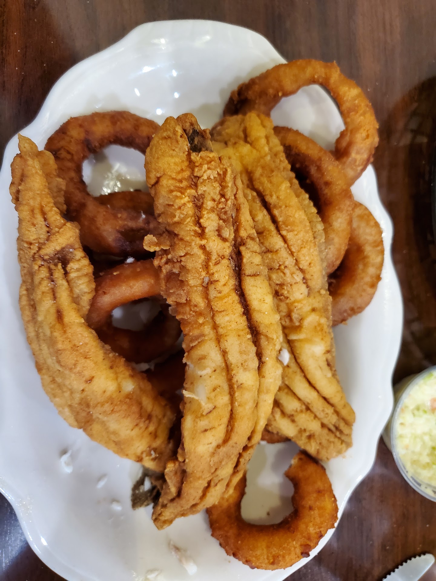 My son ordered cat fish filets. These were a bit better on the texture part. But the flavor was of old fish again. Definitely not fresh. And my guess is it was a lower cost catfish to save money. Not premium fish at all. My son was able to eat 1/2 of his before he decided he didn't want any more. He loves seafood. Never does he leave fish on a plate.