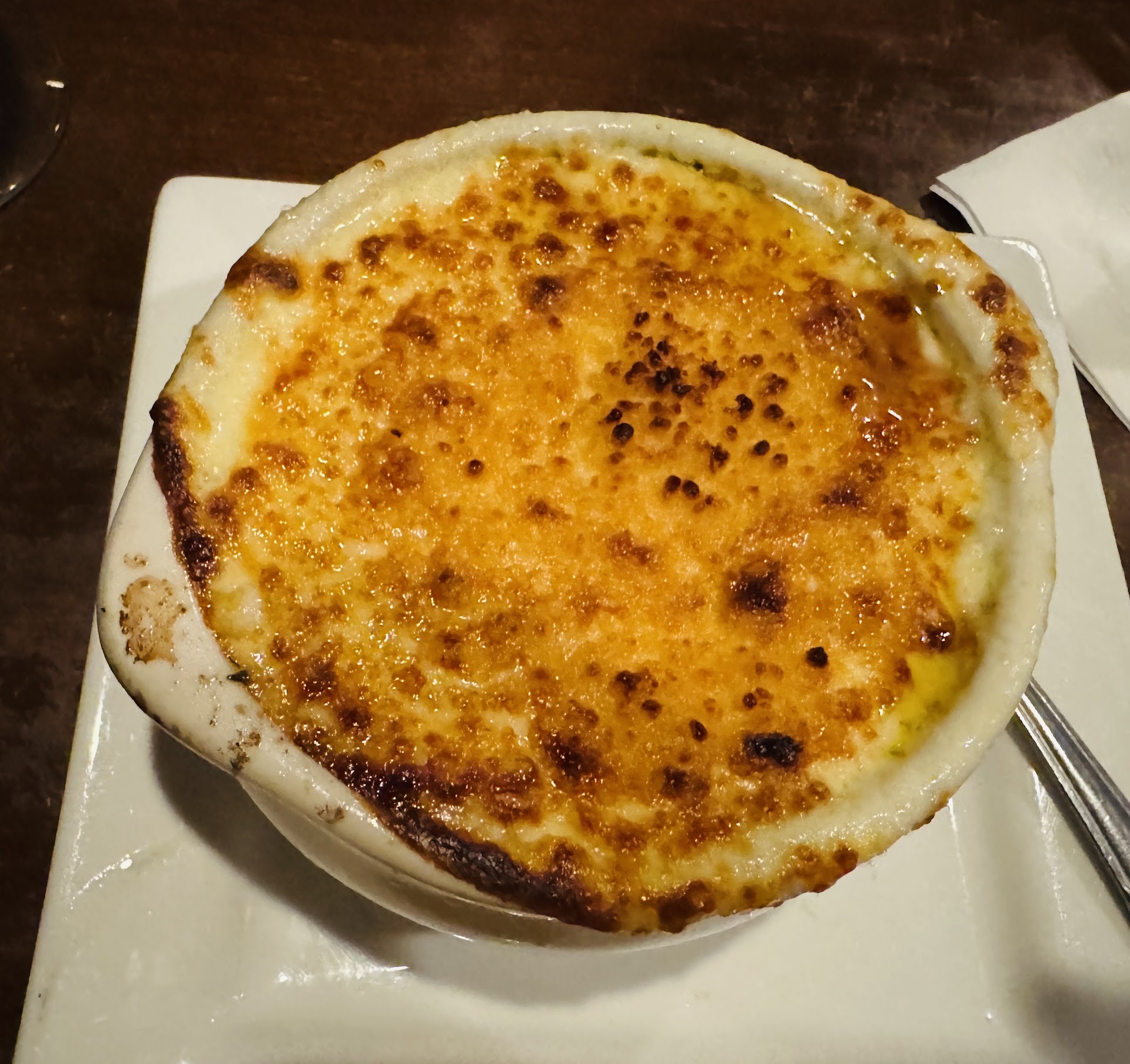 Read moreWeâve been wanting to check this out because itâs in Monroe, close to our home. Reviews were good. The booths are nice and private with curtains between. A good selection of wines. Bloody Maryâs donât include olives, just lemons and limes.đ A salad and soup are included with any dinner. We both got onion soup, it came covered in mozzarella cheese. It was excellent. The rolls were tasty too. House Cabernet was somewhat bitter, wouldnât recommend it. Hubby got the steak bites with goat cheese gnocchi. He couldnât chew several pieces of the steak. The gnocchi was overcooked and had the consistency of glue with the added goat cheese. I got the Chicken Supreme which said it was pieces of chicken breasts in a veloute sauce, with cream cheese and broccoli, topped with cheddar and mozzarella. The dish had way too much cheese with about 4 pieces of broccoli and chicken. It tasted more like a cheddar and mozzarella entree. Flavor was pretty bland. We were disappointed in our experience and wonât be back. We donât recommend it. Our bill came to $100, including a $23 bottle of wine (the very cheapest). We also had the last available slice of chocolate mousse cake. It...