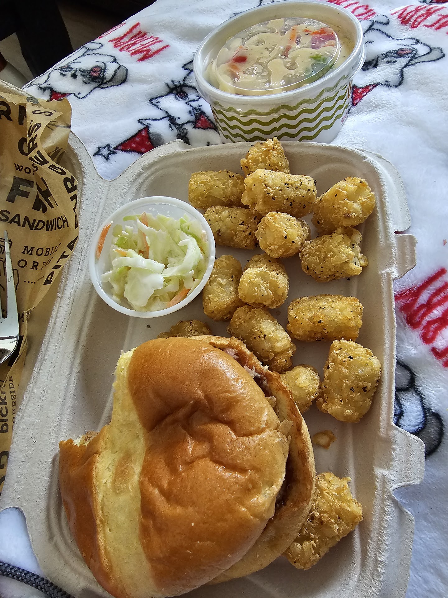 We got our order. My tots were not warm but they were very crunchy which I love crunchy tater tots! I forgave them for not having hot tots! I dipped them in bbq. DELICIOUS! The BBQ sandwich with extra bbq sauce added was amazing, juicy, the right amount of smokey flavor and tender!