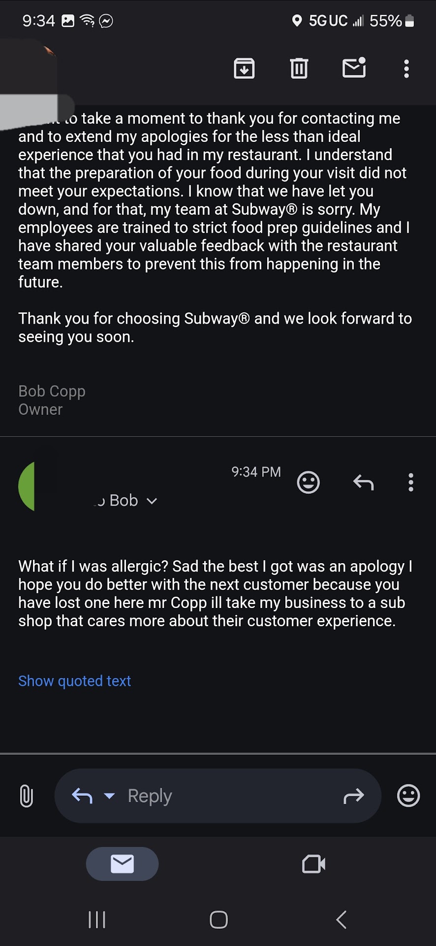 Read moreI literally watched my wife choke on the taste of the cucumbers of her sub, in a panic I tried them and couldn't even swallow them. We called the staff and we even heard someone over the phone choke because they tried it after not believing us. Still no response from the owner. We call again and are informed they were also removed that same day after we complained of the chemical like taste. My wife gets a call back of him just literally thinking she went out of her way to make this all up. I left a very upset voicemail, that evil man can keep his money and he will at least know my wife is no liar. I will never eat here again! They poisoned us and did not care. My wife couldn't eat the rest of the day. My mouth tasted...
