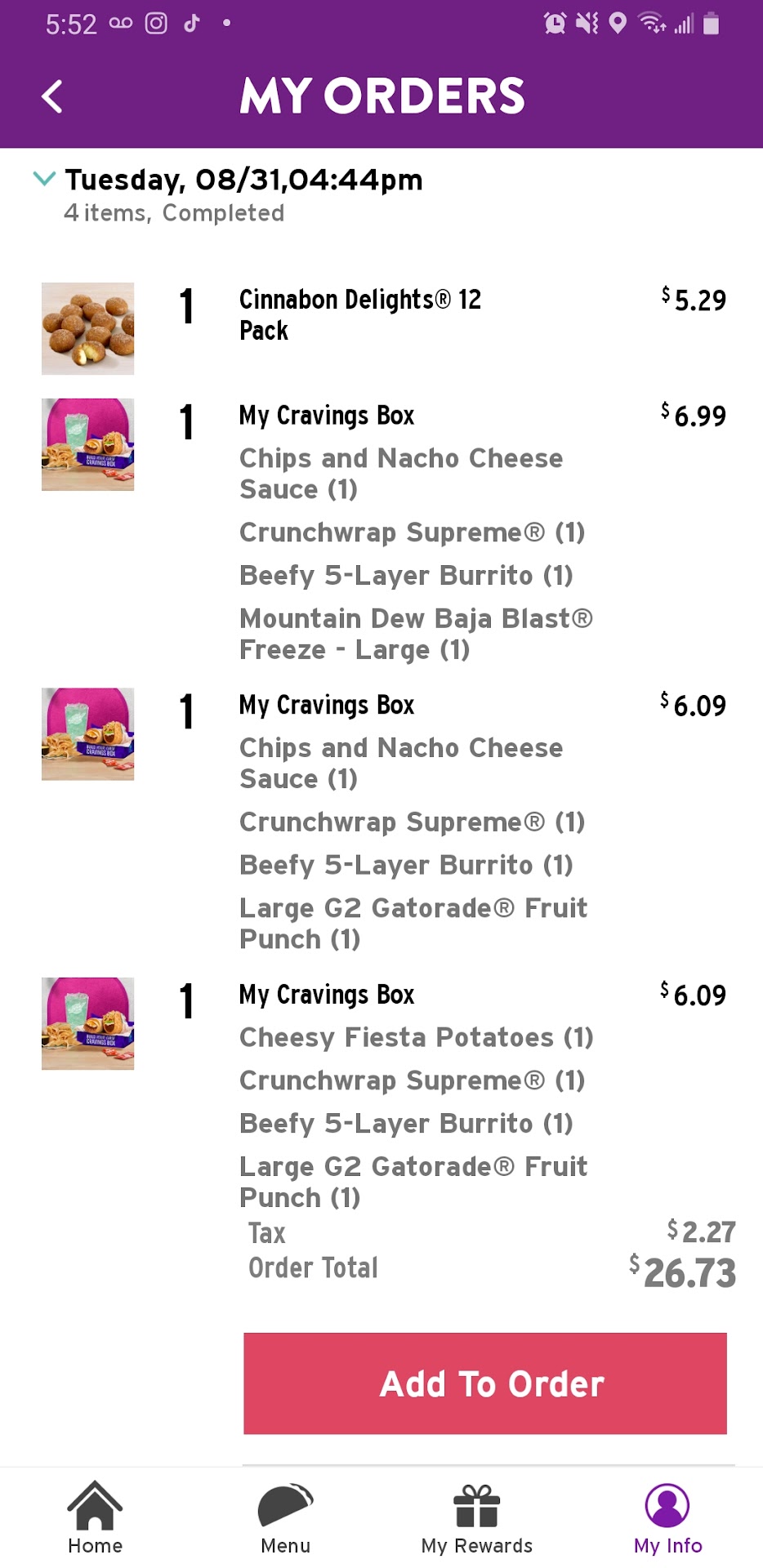 After spending about 15 minutes on my order while sitting in my car, I then spent over a half hour at Taco Bell attempting to get the mobile app to work, as well as try to communicate successfully to the employees what the problems were. This picture is just one of the things that went wrong. When removing items out of the cart in the app, it may remove the wrong item, as well as add a copy of another item. What I had in my cart originally was a few hot sauces, and what is pictured, except one of the boxes was instead supposed to be a Blue Raspberry Lemonade Freeze. But, while removing the hot sauces (because the app kept messing up with them in the cart), it also removed the Freeze, AND ADDED another box. I had to redo my cart several times, and it still got past me because I only removed one item the last time, and didn't think the app would mess up so bad. When I got home and found the extra meal, I thought maybe the employees threw it in as compensation for all the trouble I had, but nope, I checked the order history and there it was, a meal I didn't even add to my cart that I had to pay for.