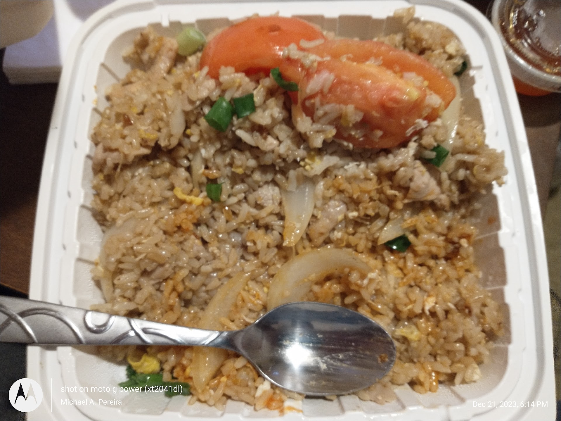 With that said, the rice is a different texture than I'm accustomed, it's moist and has big pieces of onion, green onion and half a tomato. It's sweet, probably because is might be made from coconut milk. I'm used to fried rice that's a little dryer, and has more of an umami flavor, with sprouts, green onion, peas and corn. It's complimented by hot sauce or duck sauce.
