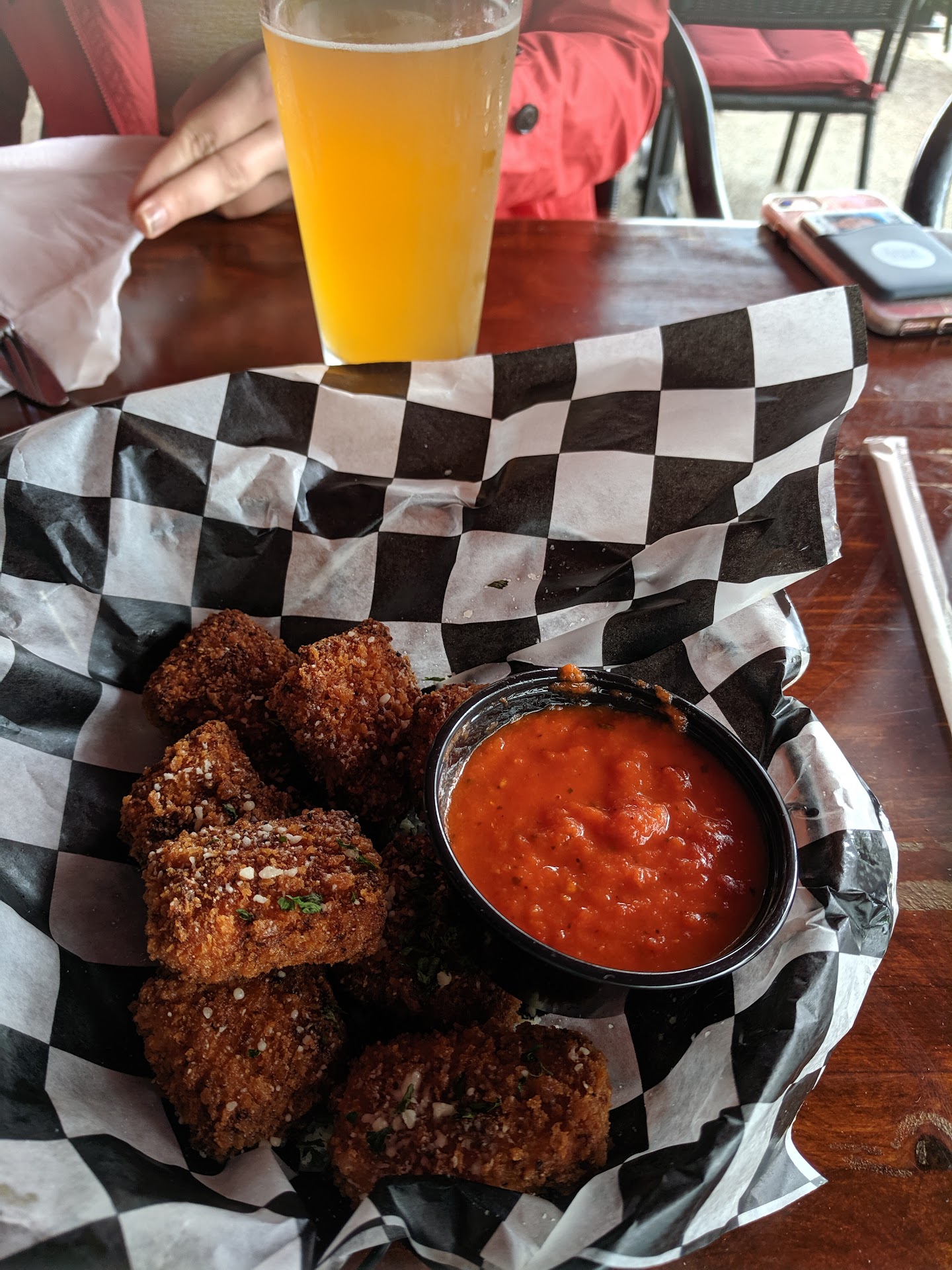 The Pub also offers a full range of beers, including the refreshingly fruity 'Rivertowne Hala Kahiki' IPA that my daughter chose for our early lunch. For an appetizer, we ordered 'Dad's Fireballs,' which are these amazing hand-breaded hotpepper cheese balls. The cheese melts remarkably smoothly and is coated in a crispy breading. So delicious.