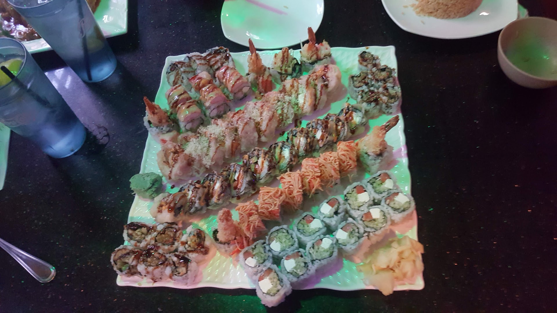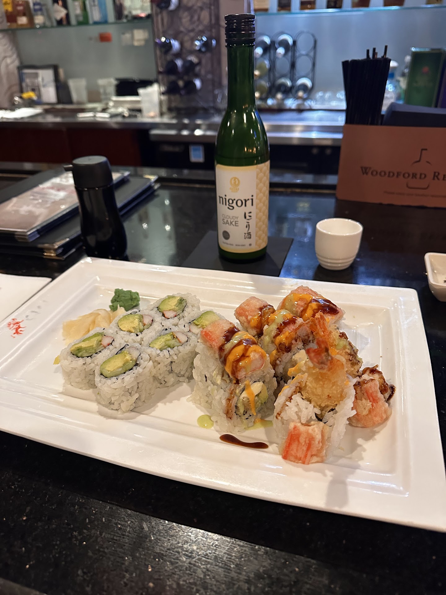 We arrived around 6pm, were greeted by a very polite young man, and declined a hibachi table. He seated us in a regular booth directly across from the bar, and said our server would be there shortly. We picked out drinks we would like from the bar menu, we had settled on a full sushi meal to share, and were considering an app while we waited for our server.