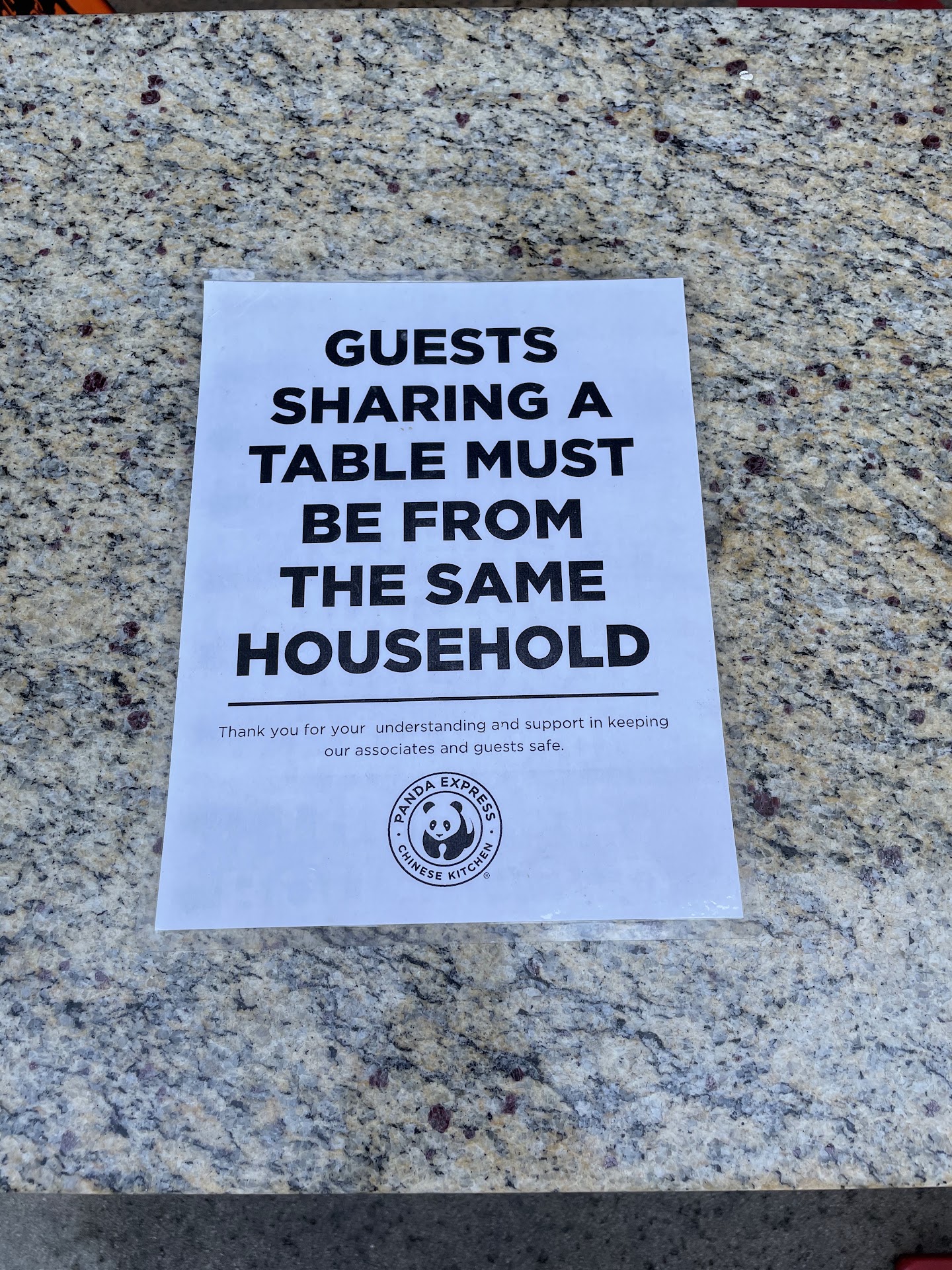 Read morePanda please explain this sign posted on your tables at this location? I would like to know the thought process on how this came into existence. Are you a law enforcement agency? Are you lawmakers? If not then what makes you think you can publicly mandate who I chose to eat with? This is not a city policy or mandate. The surrounding restaurants do not do this. This is a disgrace to your establishment. I challenge any Panda Manager that approved this to step up and apologize publicly for attempting to rob American Citizens of their God given rights. I suggest all Panda managers read and understand the American Constitution before making up tyrannical signs like this. Your customers are “King’s” we are sovereign. We need to be respected as such.
