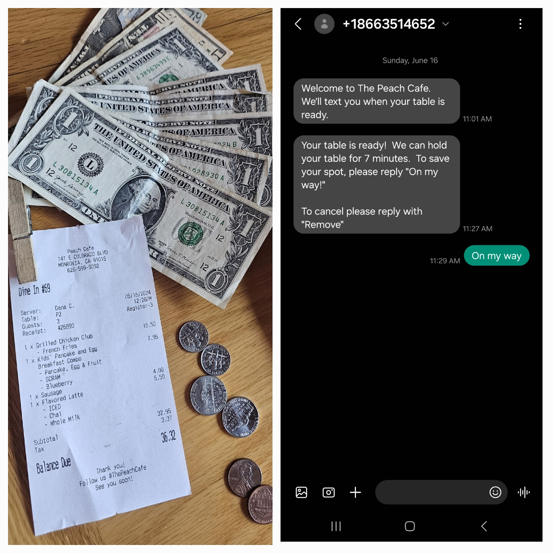 Apart from the disappointing food the cafe is great. Since it's in Monrovia there is plenty of free street parking. There was a bit of a wait since this is a popular Sunday brunch spot, but that was to be expected. They have one restroom which is fairly clean. And our server was nice and friendly. Sorry Peach Cafe for having to give you...