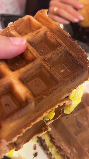 The waffle was dyed pink but you lost that of course after cooking and especially after burning it, that was the burned smell, dying waffle or pancake batter always changes the taste, texture, and moisture level. The waffle was so dry, so bland, and burned. The bacon over cooked. The scramble egg very minimal and flavorless, the cheese was another faintest sprinkle of shredded cheese.