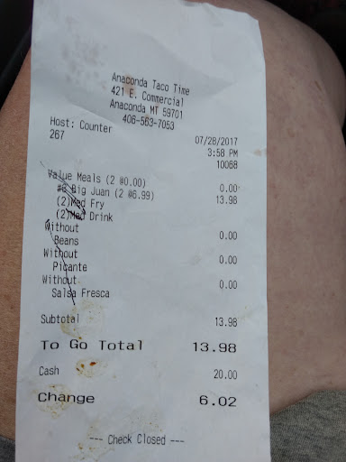ZERO STARS BUT IN ORDER TO MOVE FORWARD, I HAVE TO PICK STARS!! NO CHOICE FOR NO STARS!!!! On July 28, 2017 @ 4:00 p.m. stopped in Anaconda, Montana (421 East Commercial) for something to eat during our travels. We both ordered the #5, Big Juan value meals. I ordered mine with not tomato (as I am anapholactic allergic), beans or salsa. While waiting for our food we noticed a woman in the dining area yelling at the 5-6 teenagers who were behind the counter, to clean tables and such, we also noticed how dirty and nasty appearing the establishment is. Our order was to go, picked up our order and left. My husband's burrito had MAYBE 2 tblspn meat in it, all on one end, the rest was rice and beans. There was more rice wrapped up on the outside of his burrito than there was meat inside it. The 'mexi-fries' we're cold and the entire experience was TERRIBLE. This has to be THE WORST $13.98 we have EVER spent on food. It is highly doubtful we will EVER set foot in another...