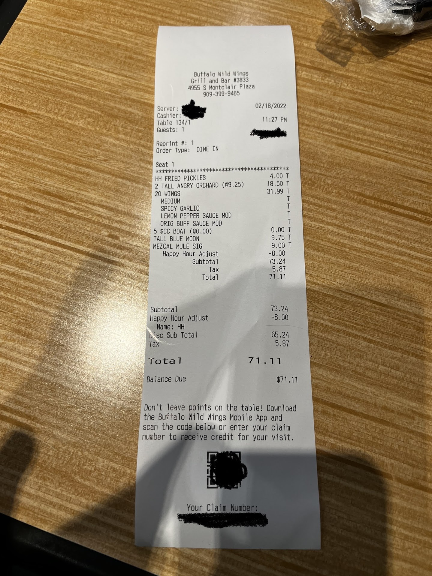 They've had a variety of "wing Tuesday" specials over the years. Each change brought them more revenue and the customer less "special." Last year they went from BOGO free to BOGO 50%. This seemingly minor change increased the cost per order greatly when measured in dollars rather than percentages. But still, my friends and I liked the server and enjoyed the wings so we kept going. But they were hardly done. They've now instituted a "takeout service fee" to cover some unexplainable thing, because when I asked for specifics about what they are charging the fee for there was no answer forthcoming.