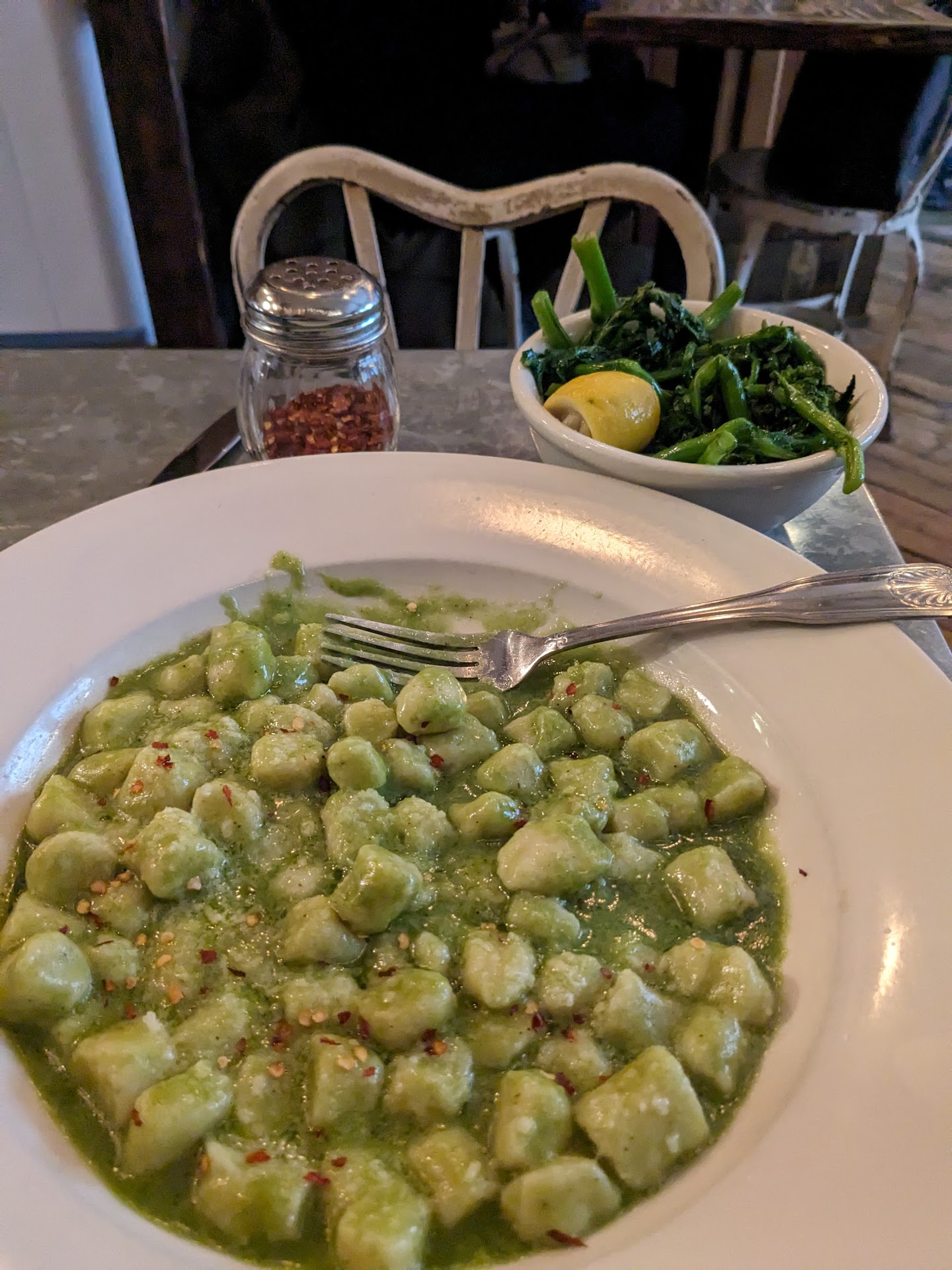 Read moreI was out walking around in the rain going to some of my local accounts and stopped in here on a whim because the pictures of their sandwiches looked really good! I was sat and was given a menu with no sandwiches on it.... the menu didn't say "dinner menu" anywhere on it, so I had no clue they had a lunch menu until after I ordered gnocchi with pesto and a side of broccoli rabe. Then I overheard the table next to me, who was given my same menu that I just had, asked for a lunch menu. I was taken back and pretty disappointed that I'm now missing out on these sandwiches. The server never even mentioned anything to me or apologized for giving me the wrong menu. My food came out, the gnocchi was delicious and very well made, the pesto on the hand was watery and bland. The broccoli rabe was very well cooked and seasoned. Throughout my short dining experience the server kept removing things from my table very promptly... too promptly. Not very many tables here, so maybe they are trained this way so that guests don't stay too long, so I let that slide. I then overheard that the server also gave the wrong soup of the day to the table next to me. I've ran and operated many restaurants and bars in my time and something was off here. I don't know if the server was just having a bad day or if they are normally this incompetent, but if they were working for me at one of my establishments I would be having a serious conversation with them. I dug the vibe here though, so I'll be giving them one more chance and coming back for one of those sandwiches sometime soon, hopefully I'll be given the correct menu the next...