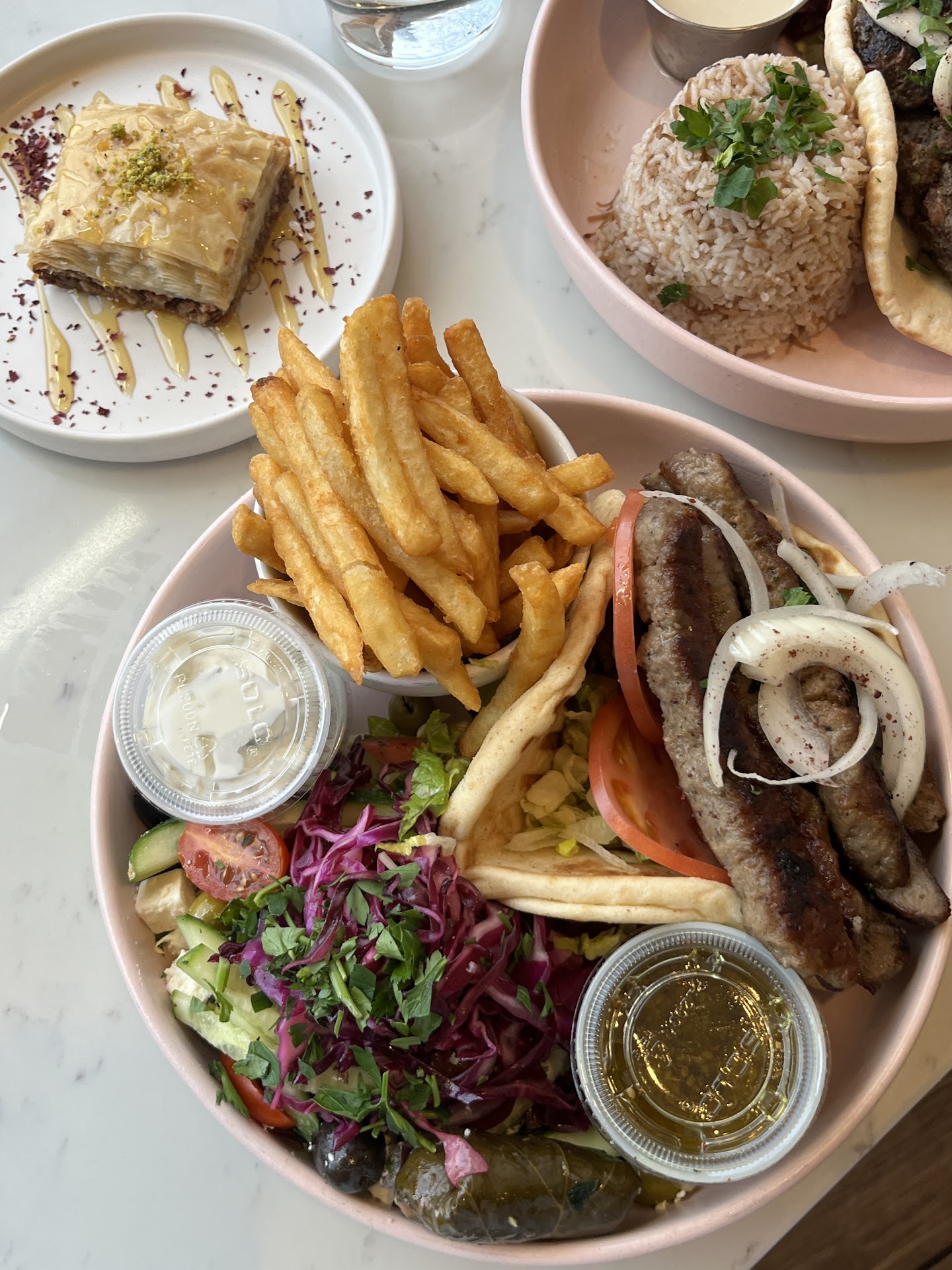 For the main course, the lamb kebabs were outstanding, grilled to perfection and served with a side of fragrant rice and a crisp, refreshing salad. The spanakopita, with its flaky pastry and savory spinach filling, was another highlight that I highly recommend.
