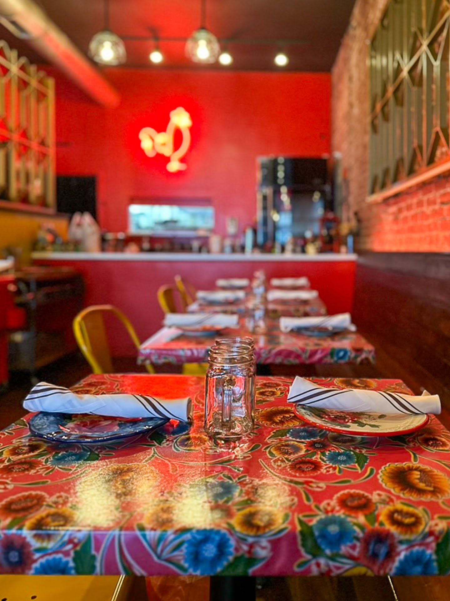 This spot is dimly lit with a glowing red rooster as it's mascot just above the food window. A gorgeous (albeit small) and cozy Thai spot where you can enjoy the scene without intrusive or invading themes or bright lights.