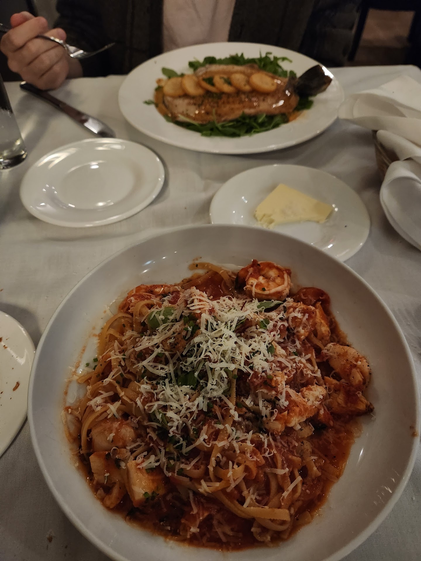 In terms of the food, there is definitely a high focus on presentation here. However, presentation is nothing without the taste and they deliver on that as well. The Burrata appetizer is a must, just look how gorgeous it is! The tomatoes and cheese are just so fresh, you won't regret getting this dish. We also got the Fig and Gorgonzola Crostini and while Gorgonzola typically has a very overpowering taste, the fig jam is such a great combination with it to both offset and complement it! For my main course, I got the Linguini dish which comes with such a delicious plum tomato sauce, scallops, shrimp, crab, and the most perfect al dente homemade pasta. My fiance got the rainbow trout, and it was also flavorful and cooked to perfection! The little potatoes that it comes with are so adorable and tasty!