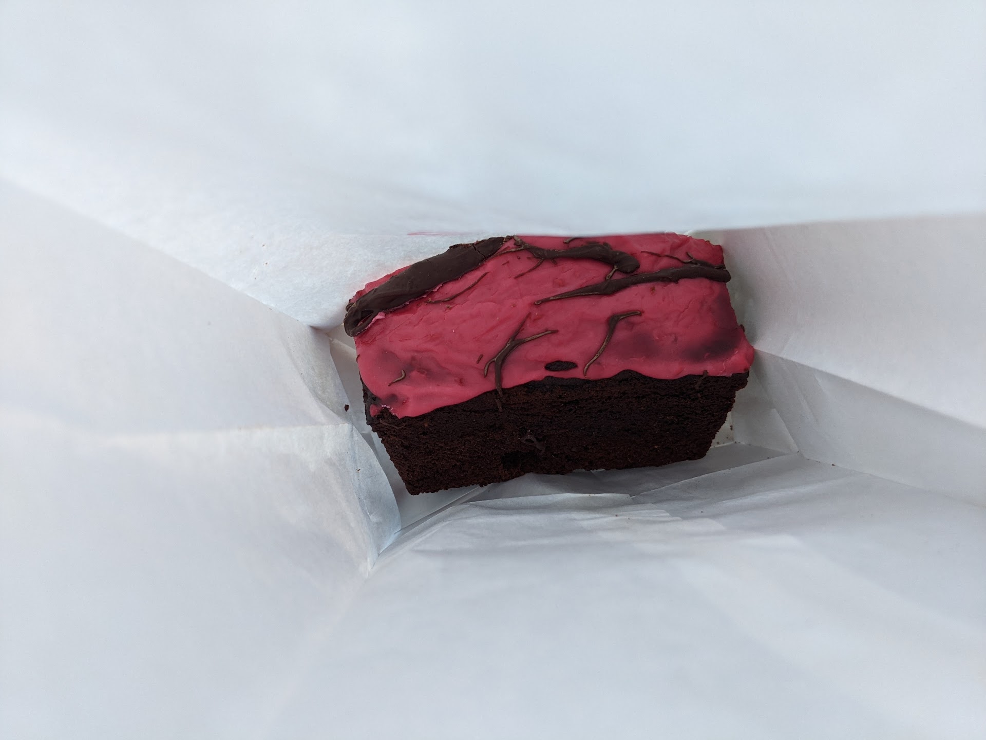 I ended up selecting the best looking one of the bunch - a slice of the chocolate raspberry bread. Based on the taste/density, this could easily be sold as cake too, and I actually had to go onto their website prior to writing this review to confirm which it was. It was very scrumptious, with an all-natural raspberry puree/frosting on top. I took an awkward picture (attached) of the slice in my little white bag, and it didn't occur to me until after I ate it a few minutes later that I could have just taken it out of the bag and photographed it. Oh well - we're all works in progress at the end of the day. The only constructive feedback I have is that my particular slice was an end piece, and the edge was a little tough/dry, but the positives far outweighed the negatives.